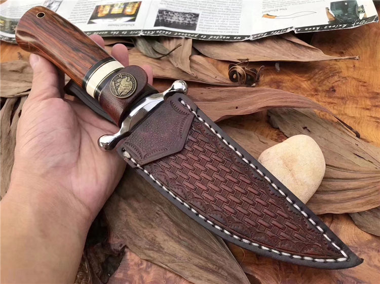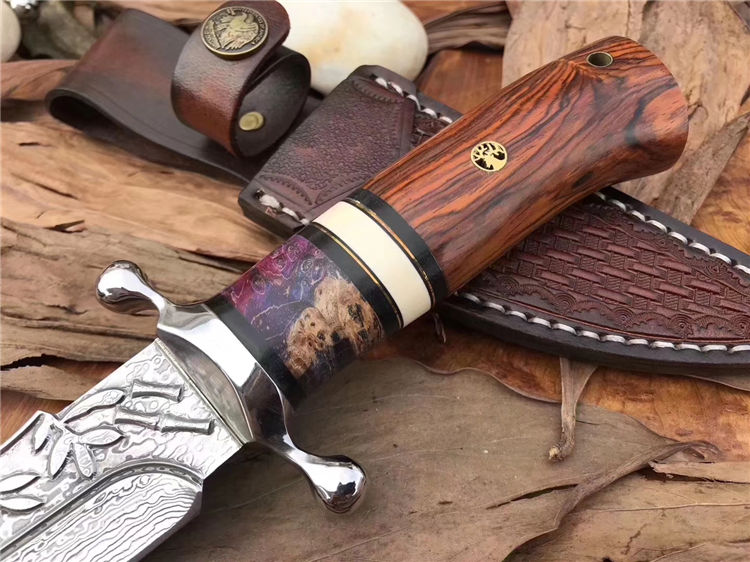 手工缝制精致皮套采用高端稳定固化颜色木+黄檀木手柄、大马士革VG10钢心,手工缝制精致皮套