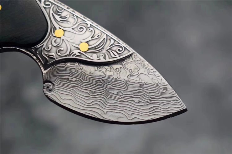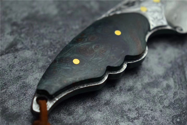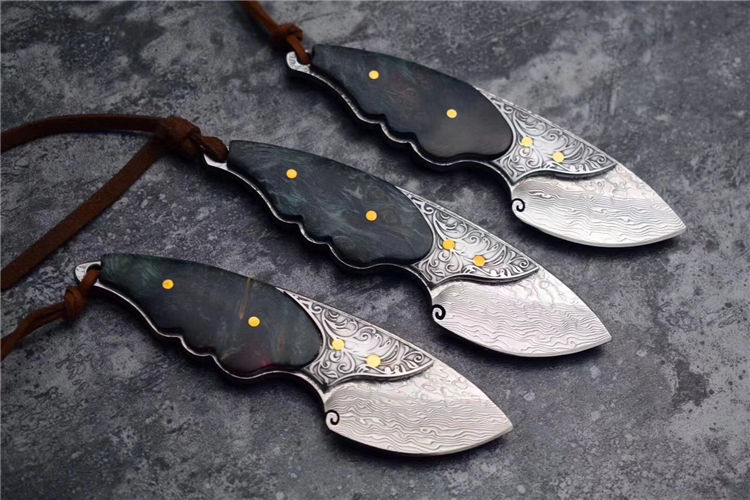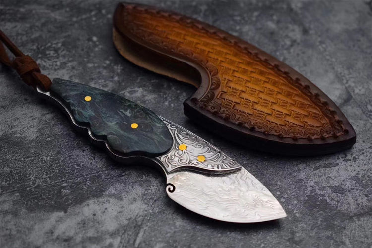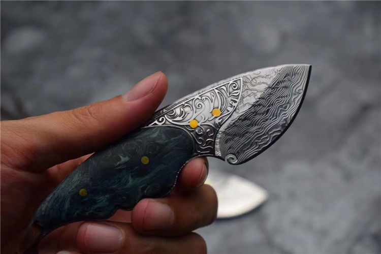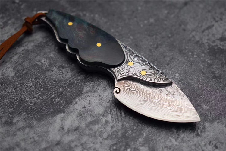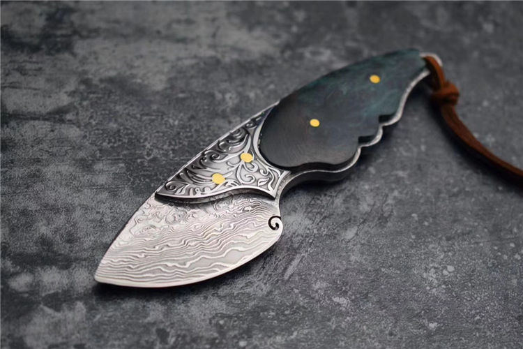 喜欢迷你款的刀友们不要错过,根据(小绿鲷鱼)外观灵感设计,该刀选用进口一体大马士革钢(不带钢芯)105层,经真空热处理硬度60HRC,整刀钢材厚度4MM,柄部,钢头精雕唐草花纹图案,显得非常灵动,搭配,固化稳定木材,内双柳钉固定,青色火焰,瑰丽绚烂,充满了神秘的浪漫色彩,此刀无论在做工上还是用料上都专挑最好材料生产制作,一款精品好东西,不要错过