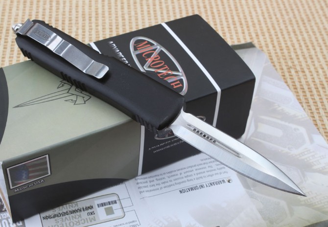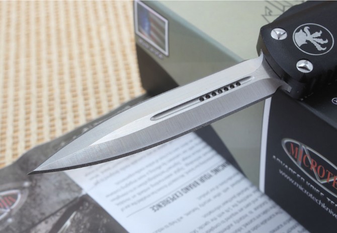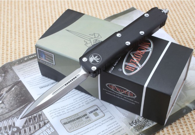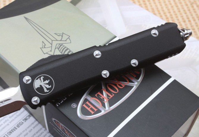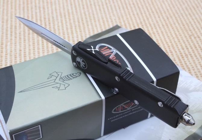 微技术UT85双锋全刃跳刀 总长:20CM 刀片长度:8CM 刀片厚度:4MM 刃材:D2 手材:铝 硬度:58-59HRC 净重:97克 包装:彩盒