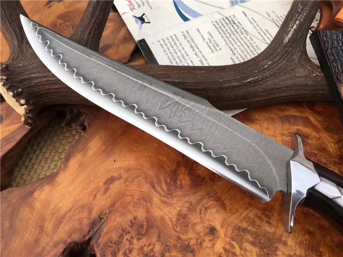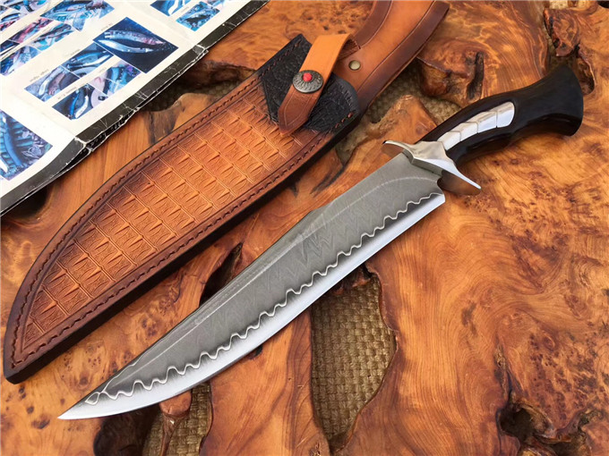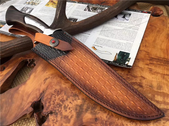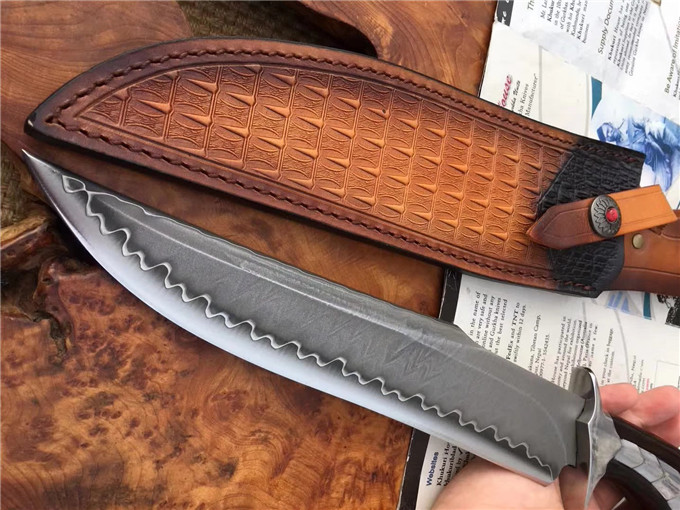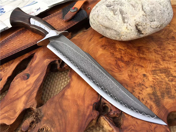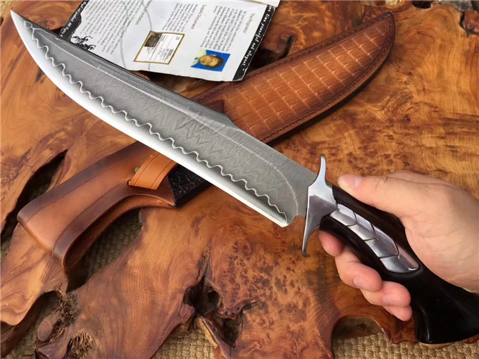 大马士革火麒麟大博弈直刀 全长:37.7cm 刃长:24cm 柄长:13.5 刃厚:5.5mm 刃宽:4.5cm(最宽处) 柄材:黑檀木 刃材:自主研发锻大马士革钢(钢心9铬18钼0.2cm厚) 锻大马士革钢,钢心9铬18钼0.2cm厚,真空热处理,硬度58/60度,配进口头层牛皮