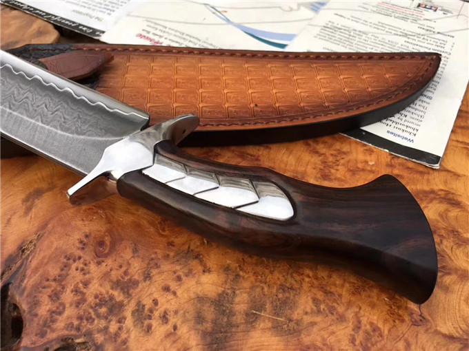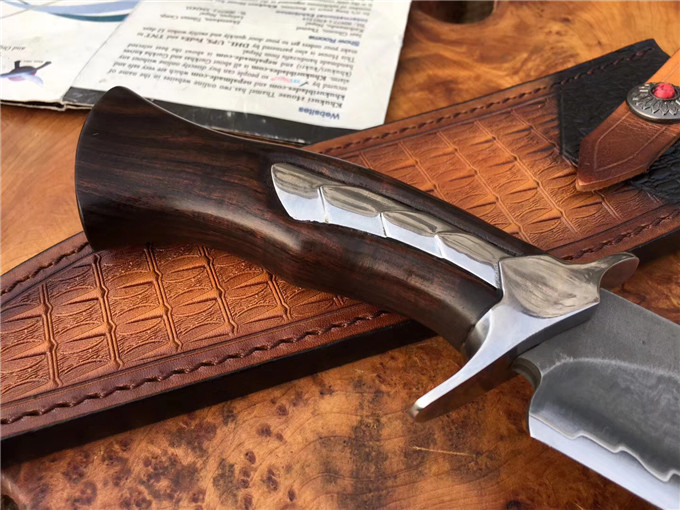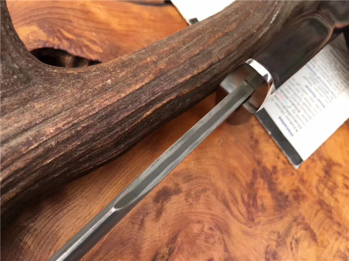 锻大马士革钢,钢心9铬18钼0.2cm厚,真空热处理,硬度58/60度,配进口头层牛皮