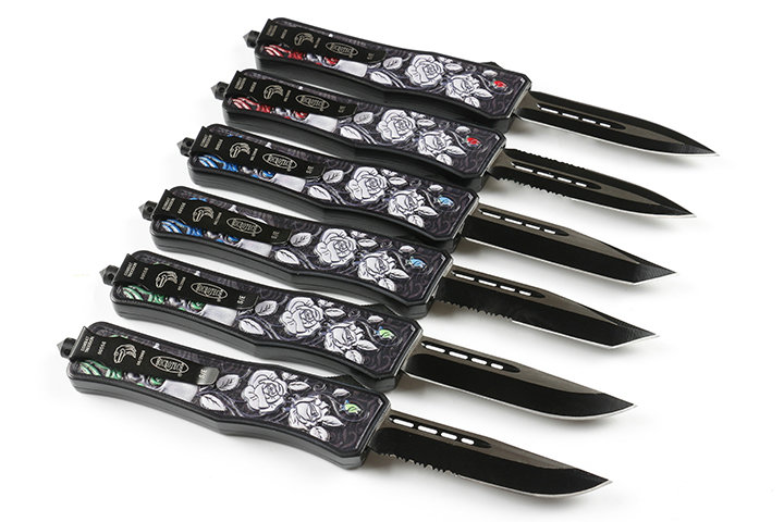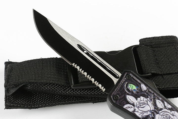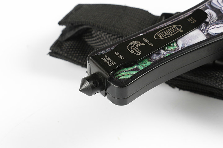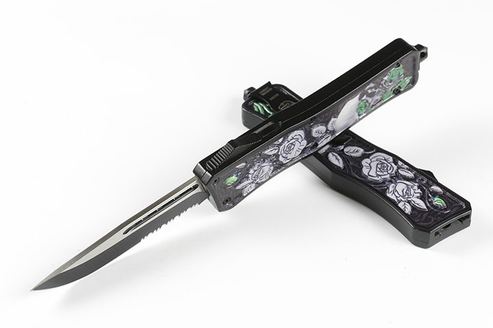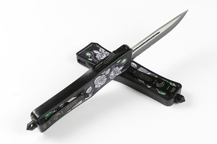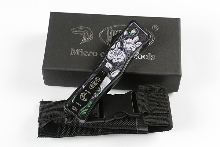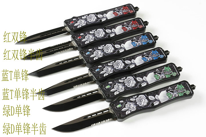 微技术F型玫瑰图直弹刀 类型:直出弹簧刀 品牌:MICROTECH微技术(仿品) 开启长度:24.0CM 合起长度:14.2CM 刃长:9.8cm 刃厚:0.3CM 硬度:57HRC 刃材:440 表面:刀刃发黑伴拉丝 把手:锌铝合金 净重:240克(整刀) 毛重:345克(含包装物) 开合:双动作,直推开关,自动弹出和收回 包装:耐磨专用战术尼龙套 口袋刀夹:弹簧刀夹 玻璃敲击器:钨质玻璃敲击器,共6种刀刃,下单请注明,谢谢