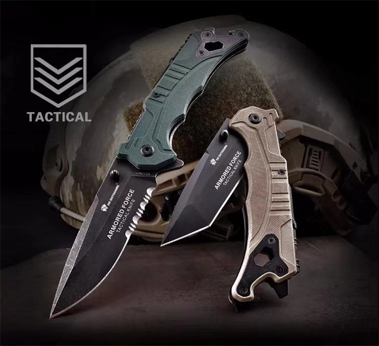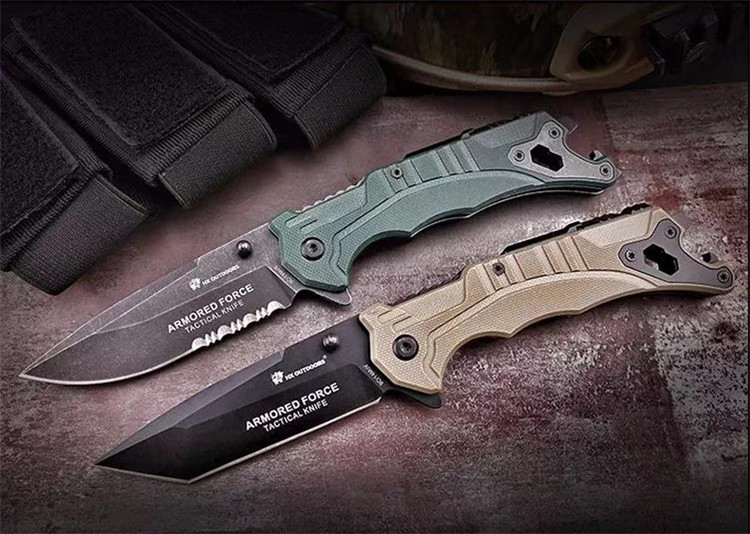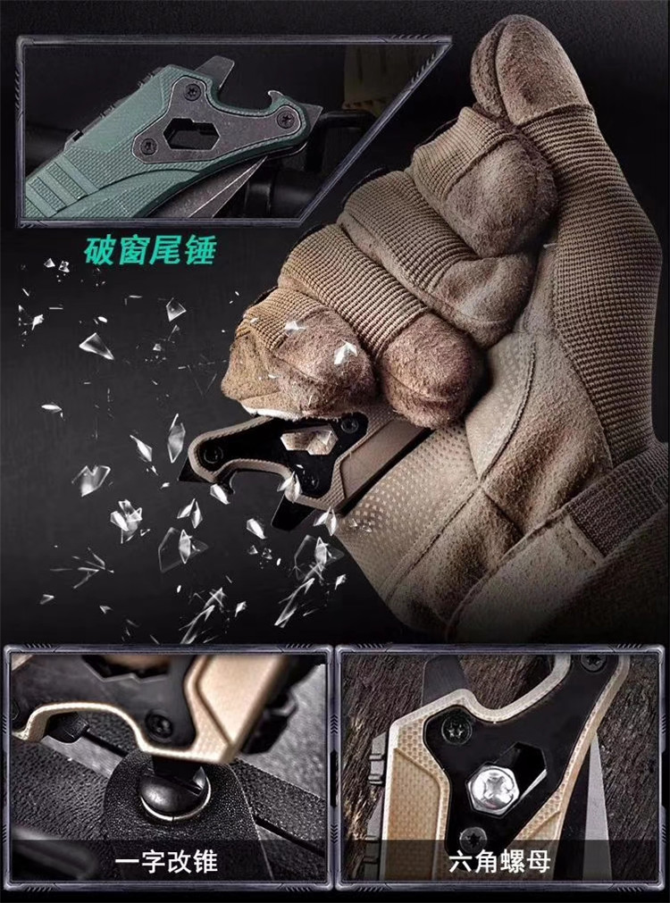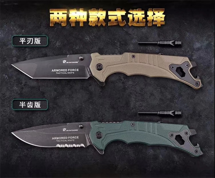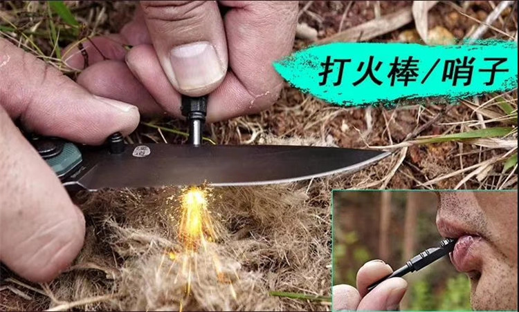 刀刃用材9Cr14Mov,手柄用材G10复合纤维;刀刃分平刃和半齿半刃;手柄背部内置打火棒、哨子,柄尾设置六角螺母,尾锥,一字改锥、开瓶器;可折叠设计,收纳小巧便携