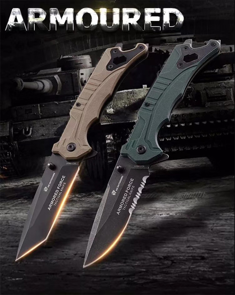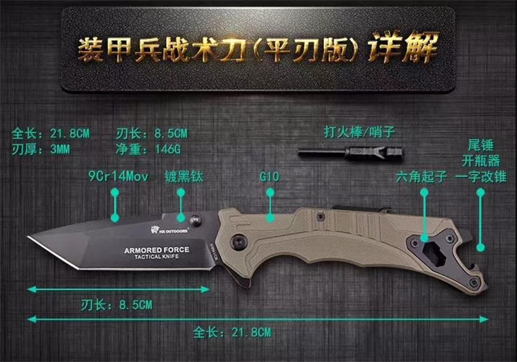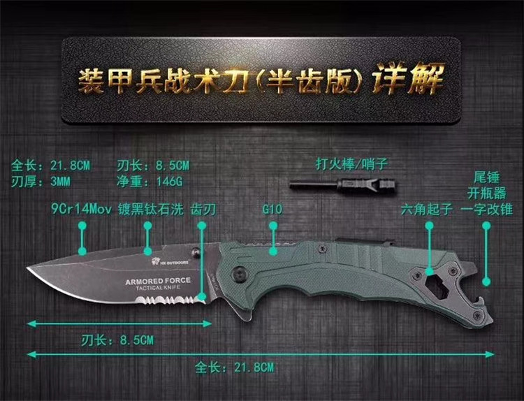 汉道装甲兵战术折刀 刀刃用材9Cr14Mov,手柄用材G10复合纤维;刀刃分平刃和半齿半刃;手柄背部内置打火棒、哨子,柄尾设置六角螺母,尾锥,一字改锥、开瓶器;可折叠设计,收纳小巧便携