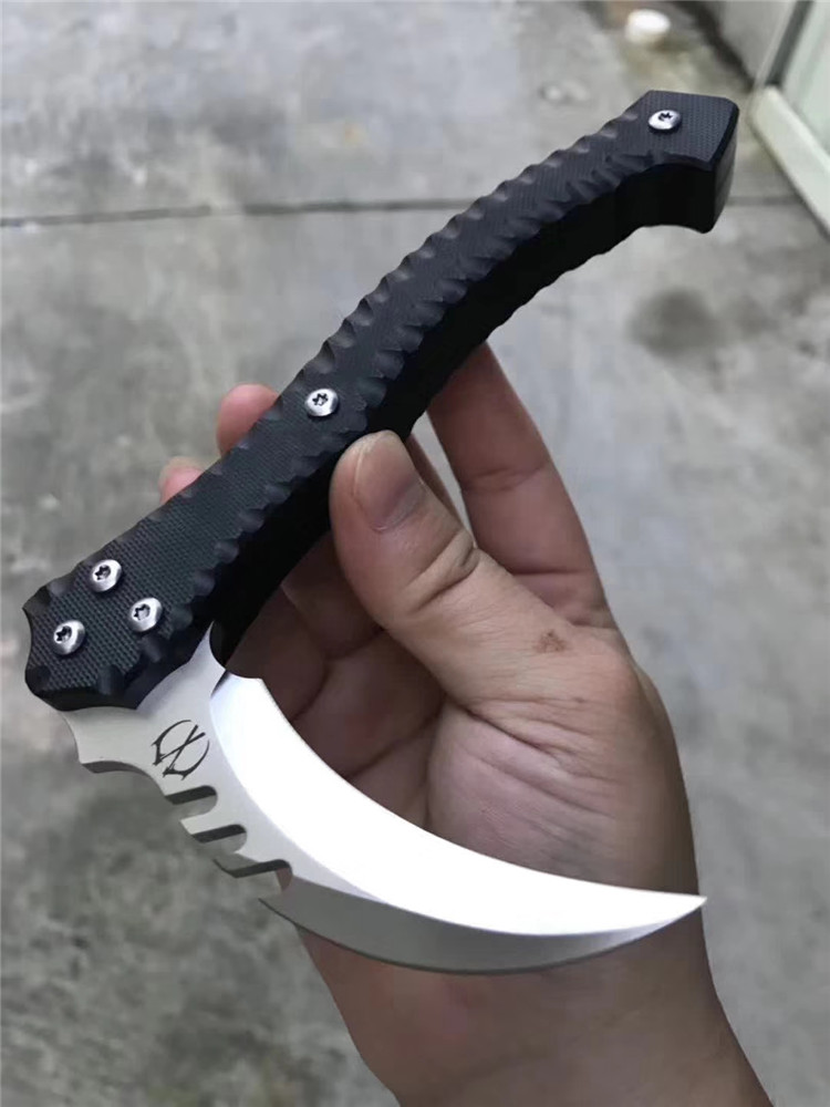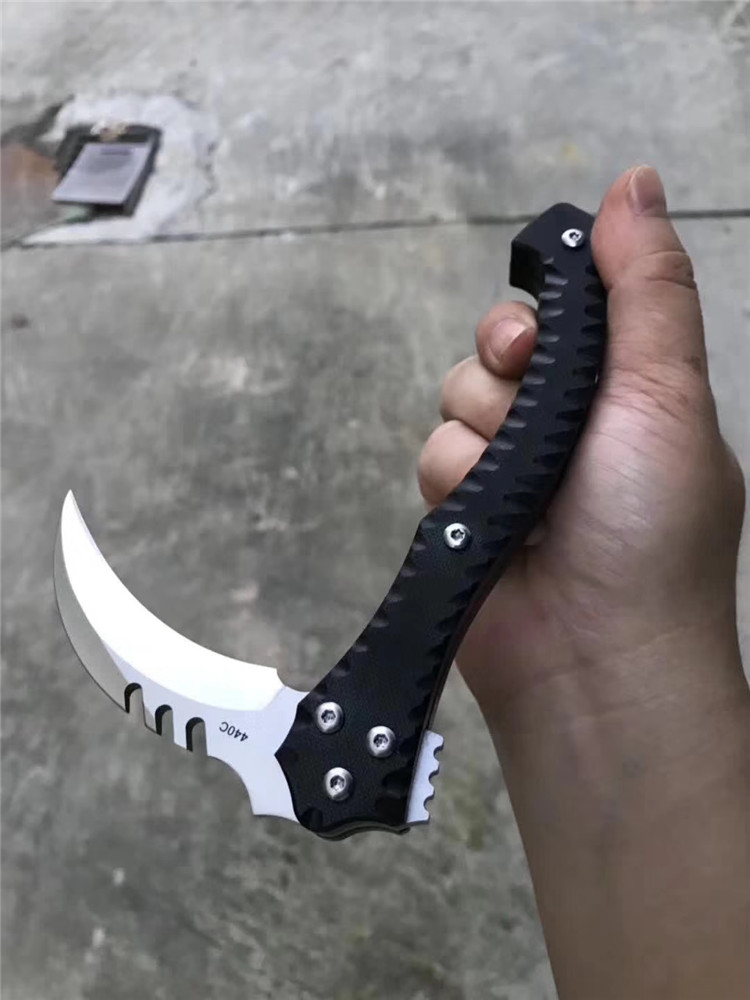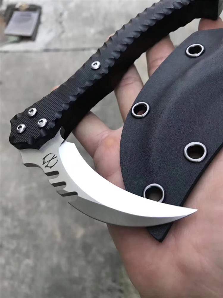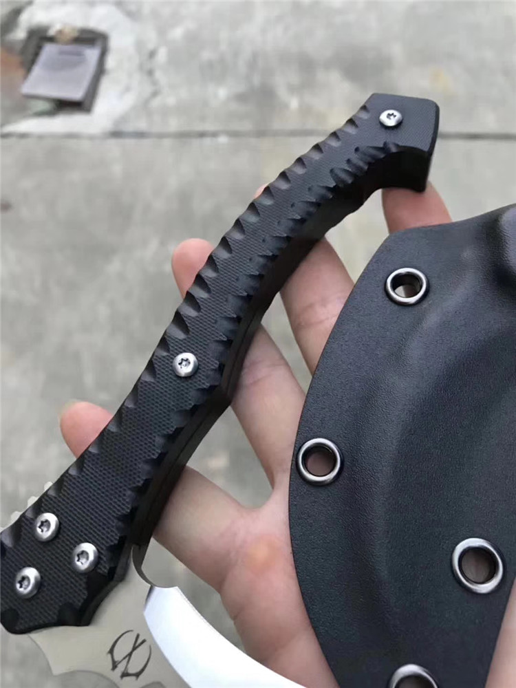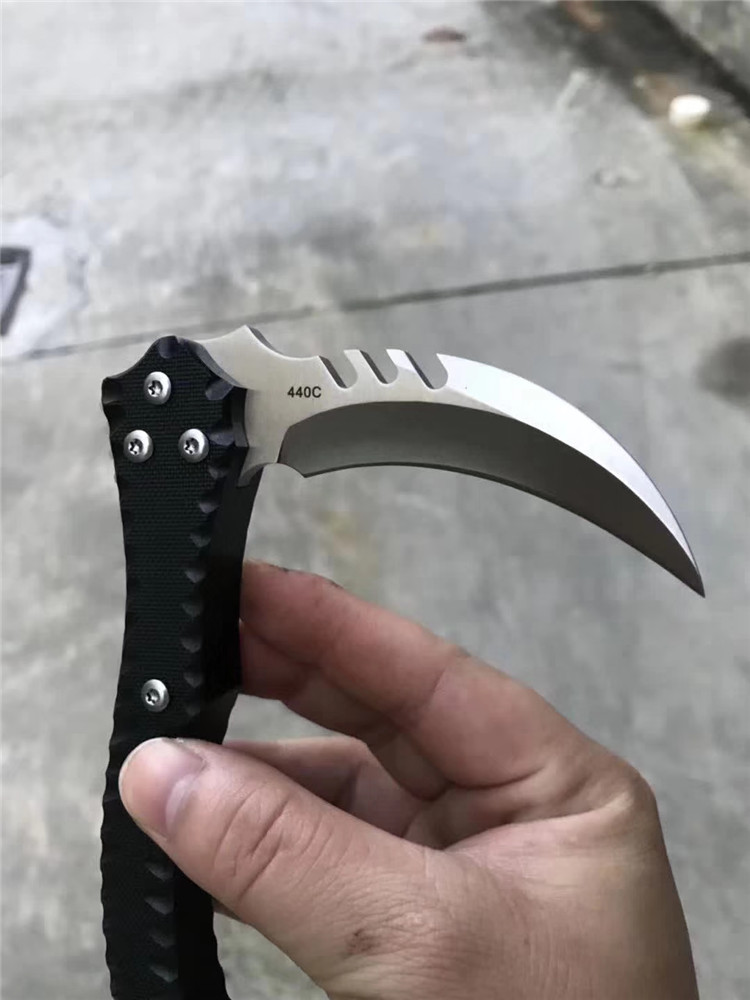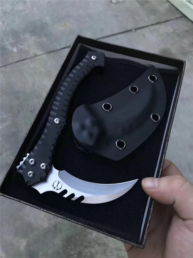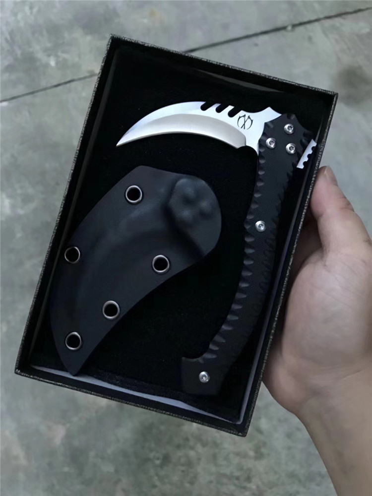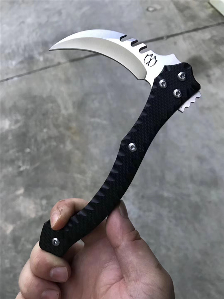 新款开山魔镰刀 刃长:75mm 刃宽:25mm 刃厚:4.5mm 材料:440c不锈钢 硬度:58 柄长:160mm 柄厚:16mm 柄宽:最窄处16,最宽处28 手柄:黑色格纹G10 cnc 表面:加工 搭配细纹2.0厚材料k板K鞘 钢原色表面加工哑光,配礼品盒! EDC拍照背景实物好帮手,别有一番风味