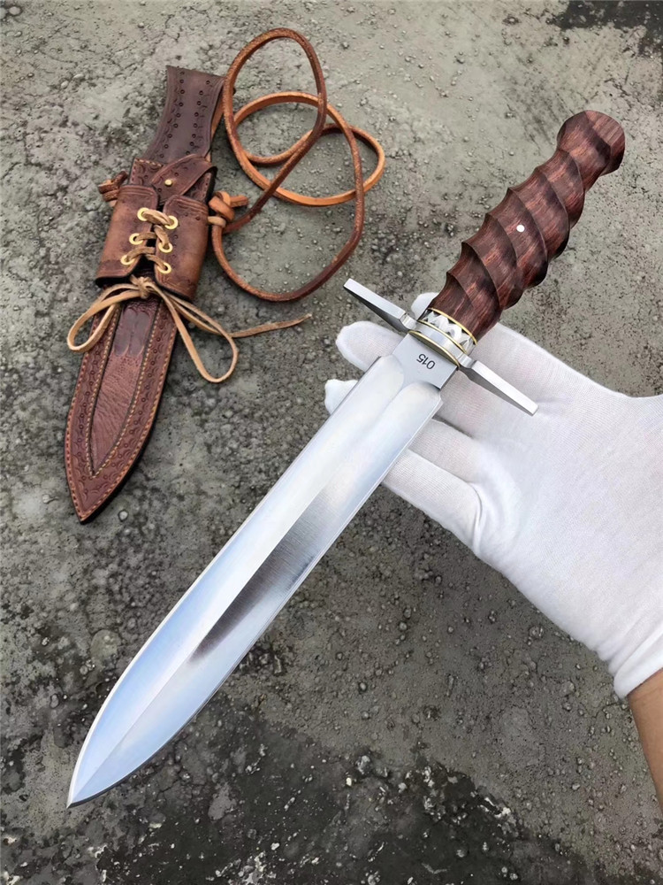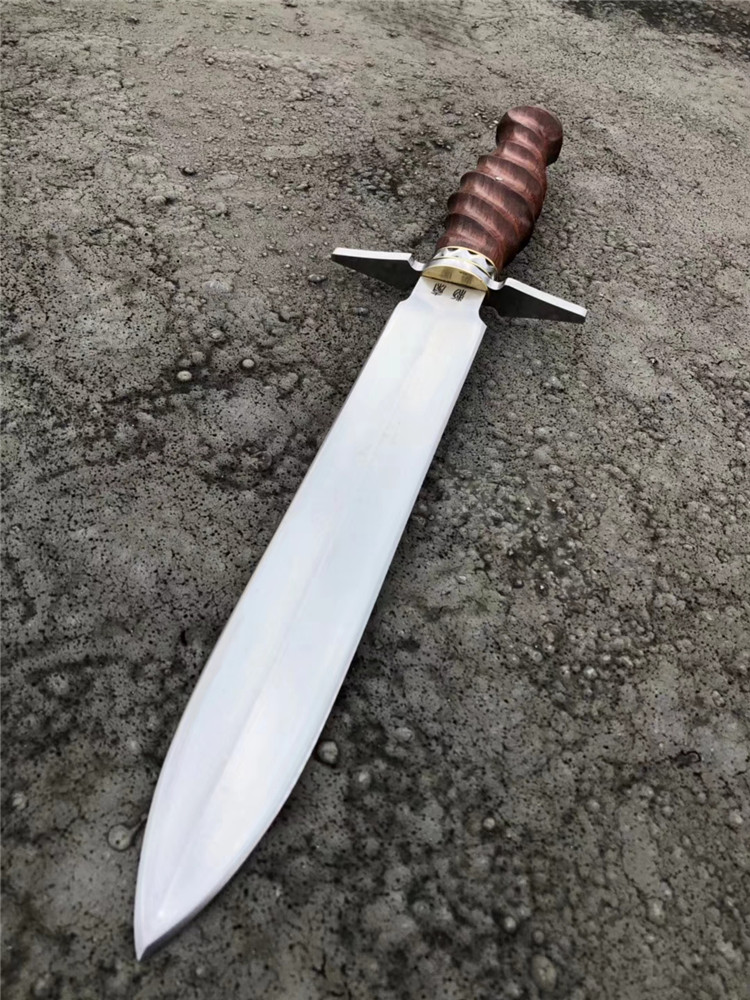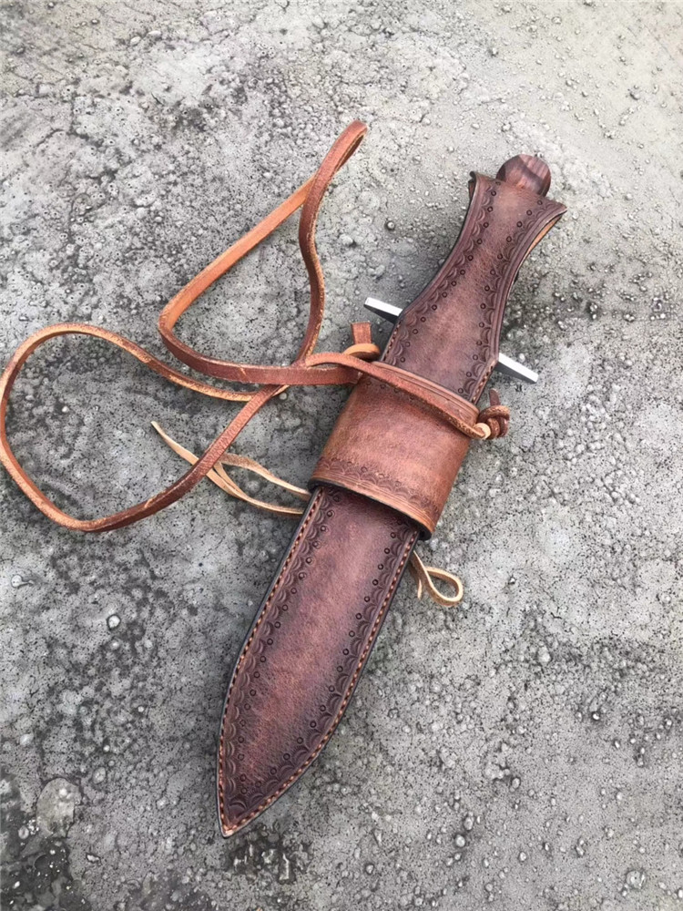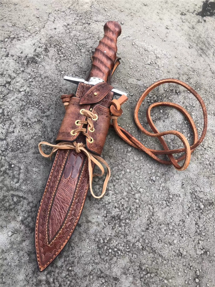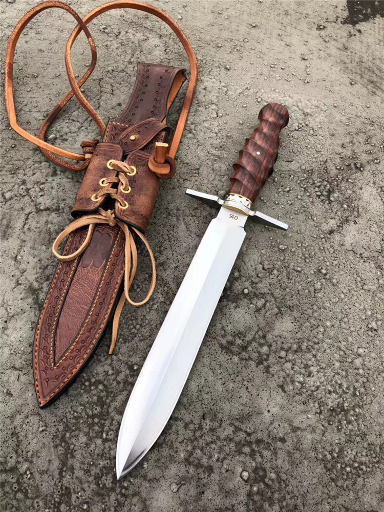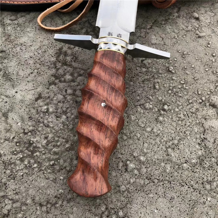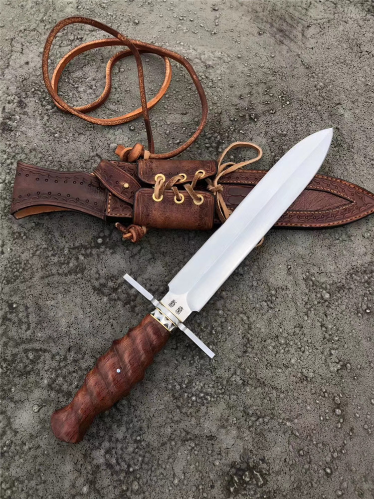 大师刀匠作品,王者风范之刃,拥有着最高权力与荣誉,欧美高端名刀,刃钢采用,日本进口高速钢,硬度达到60HRC,真空热处理,淬火等,钢口非常好,全手工双面开刃,表面拉丝效果,手柄用料,缅甸大红酸枝/手工打磨(旋螺纹)形状+钢头手工挫花,内加柳钉固定不易松动,皮套,进口阿根廷牛皮套,手工缝制镶嵌鳄鱼皮、外部设计鞋帽挂带皮配件,方便随身携带