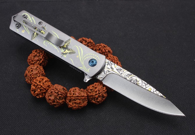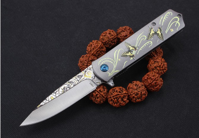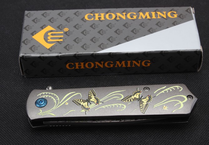 创名CM83快开折刀 全长:20.1cm 刃长;5.6cm 柄长:11.4cm 刃宽:2.2cm 刃厚:3.0mm 刃材:440C 重量:212g(含包装物) 硬度:57HRC 表面:三D打印图案刃口沙光 柄材:钢片三D打印图案 锁型:线锁 其他:配彩盒