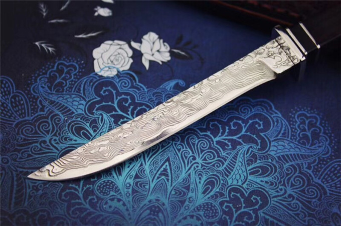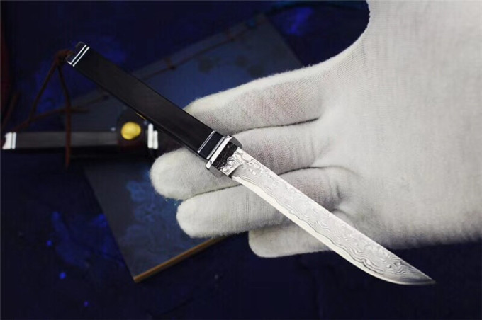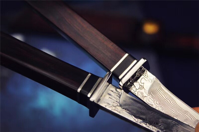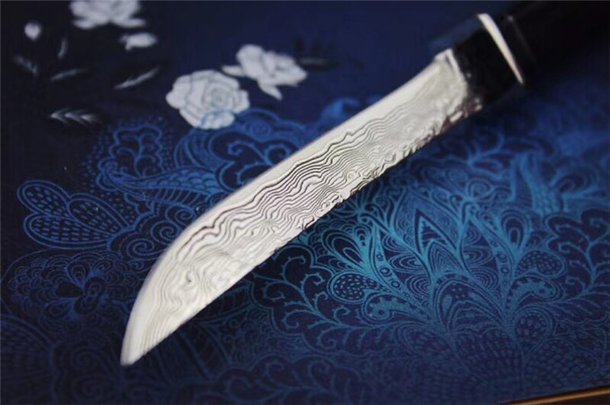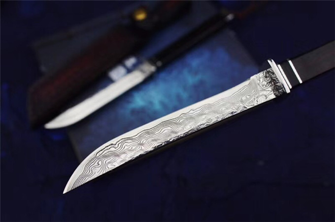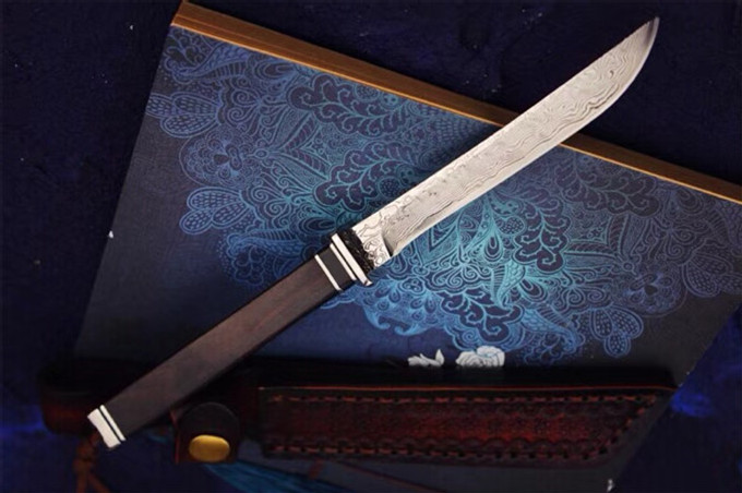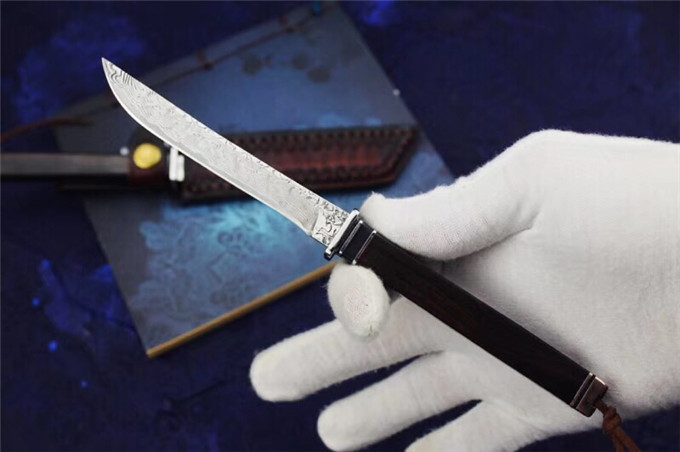 大马士革武魂小武士直刀 总长:20.5cm 刃长:10.5cm 刃厚:3mm 刃最宽处:1.3cm 刃材:大马士革钢 硬度:60HRC 柄材:钢头+黑牛角+非洲黑檀木 包装:高级硬盒+高端手工牛皮刀套