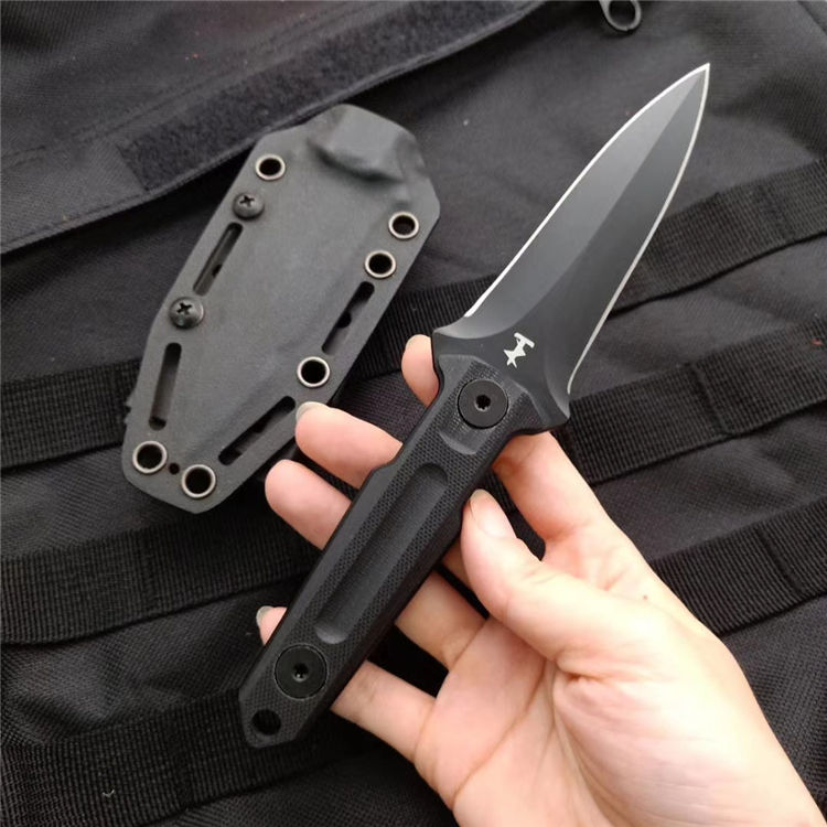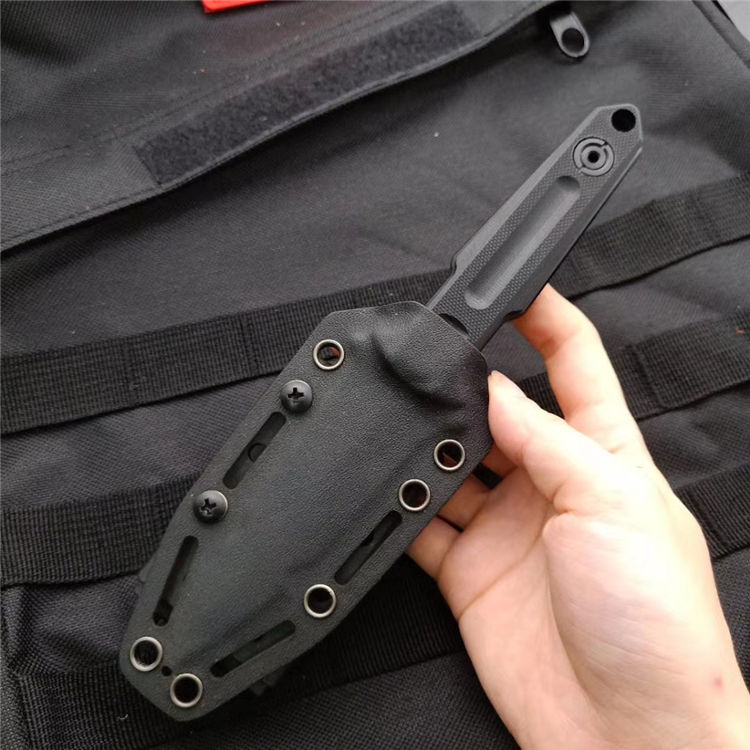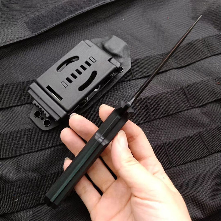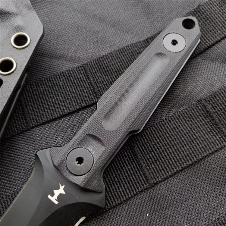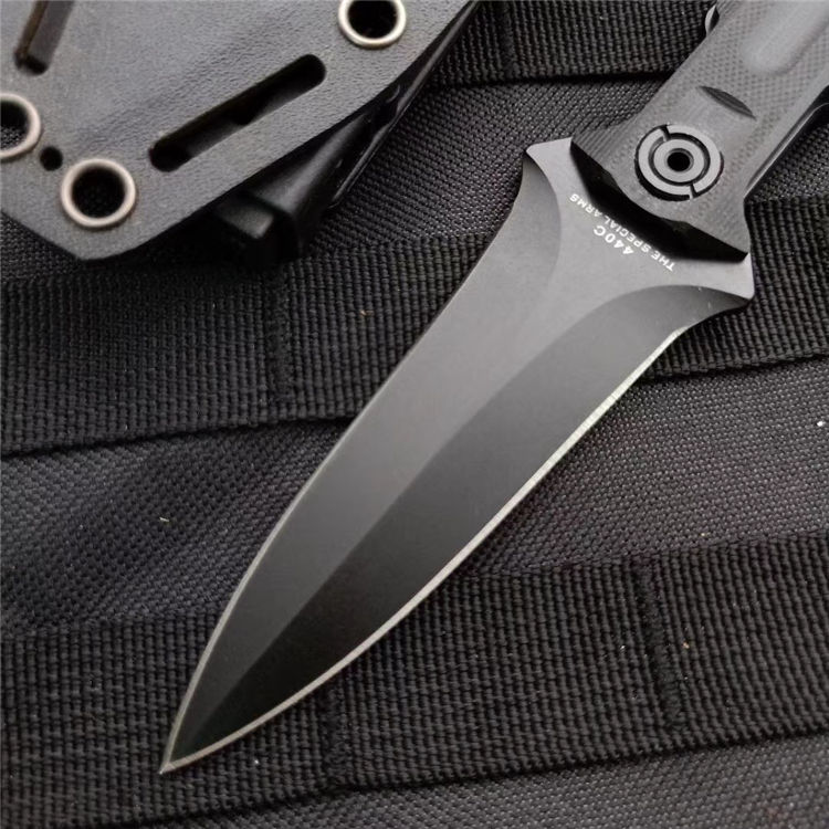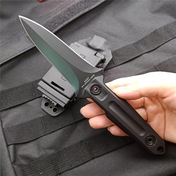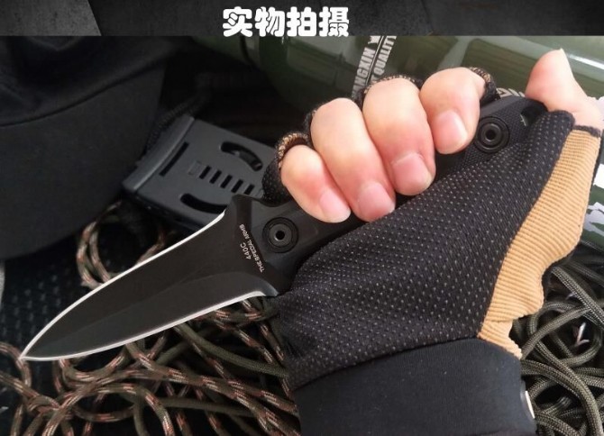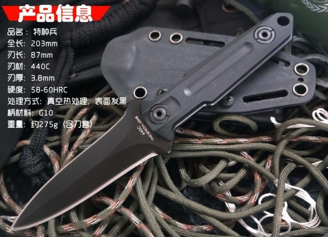 二代百炼特种兵格斗刀 全长:203MM 刃长:87MM 刃材:440C 刃厚:3.8MM 刃面处理:表面发黑 热处理:真空热处理 硬度: 58-60HRC 柄材:G10 刀鞘:K鞘 包装:黑色礼品盒 总重:约275G(包括黑色礼品盒等)