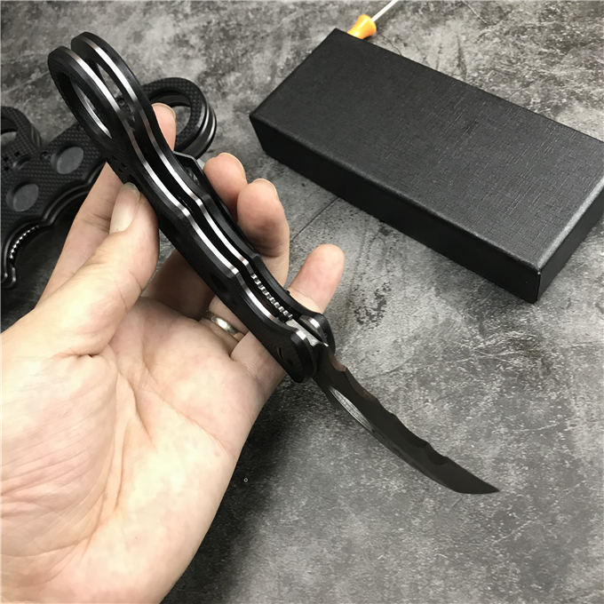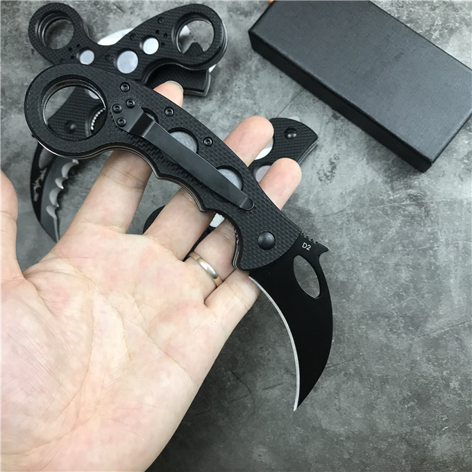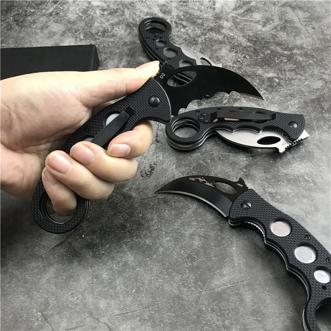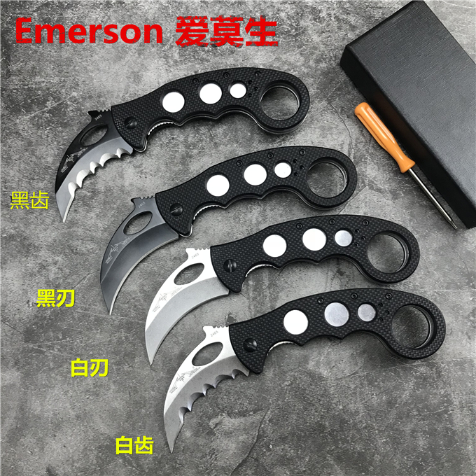 EMERSON爱默生公司其独有的快开钩设计,具有独特的使用方法,随身携带时,刀具通过口袋夹锁定在裤袋里。当您将食指插入刀柄边缘的洞孔时,随即向前从口袋中抽出。刀具大部分还挂在口袋里时,其独特的快开钩已经配合着已将刀刃迅速展开了。使得“鹰爪”离开口袋时就已经可以顺势向对手攻击采用进口D2刃材料,抛磨细致,快拉钩功能易用性超强,随刀付送左边背夹和工具刀