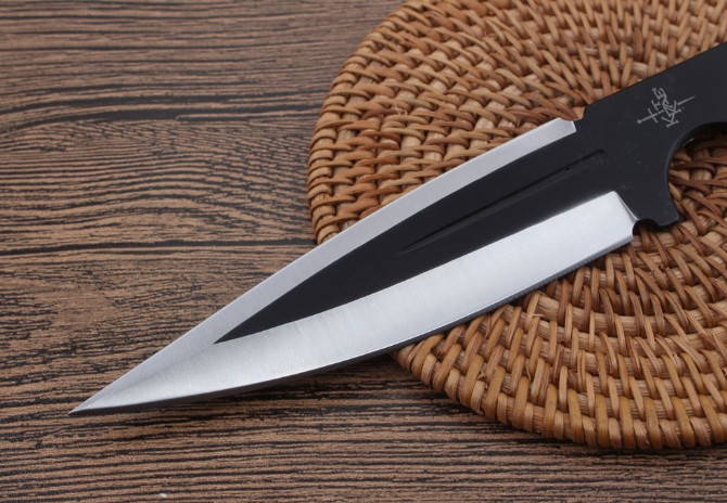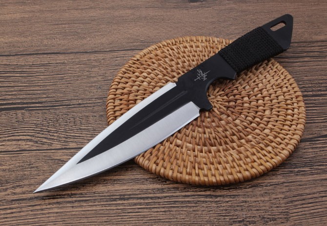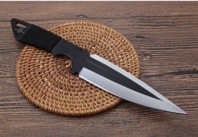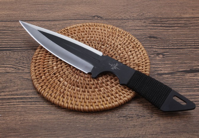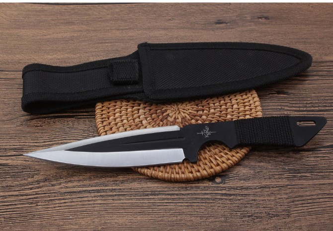 飞直两用刀黑版 全长:21.5cm 刃长:9.9cm 柄长:10.8cm 刃宽:2.8cm(最宽处) 刃厚:3.2mm 刃材:3CR13MOV 硬度:57HRC 刀柄:一体钢柄扎防滑绳 表面:黑钛刃口沙光 重量:118克(含包装) 备注:配加厚尼龙套,非常锋利。可当飞镖.直刀使用