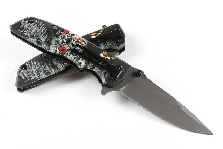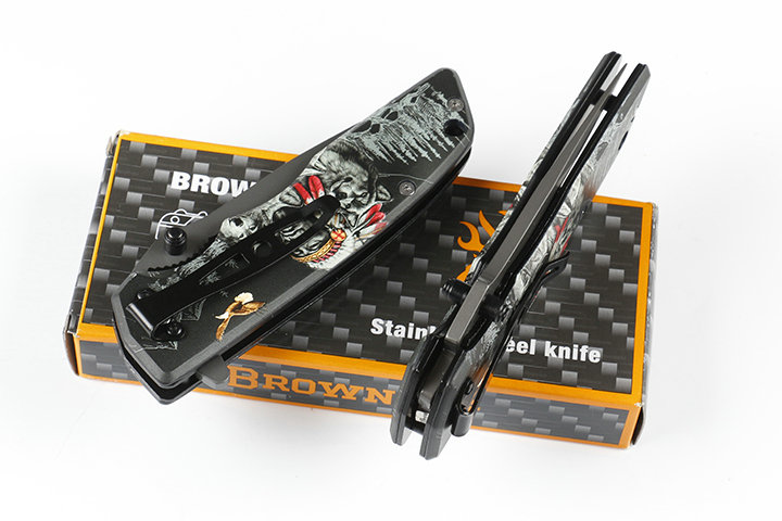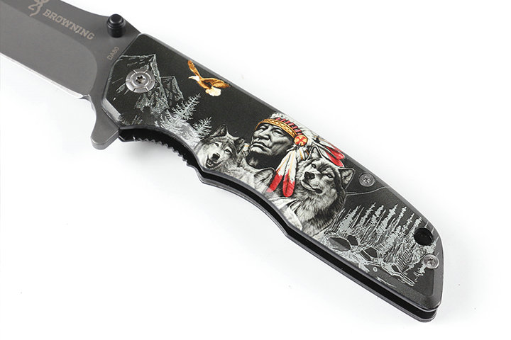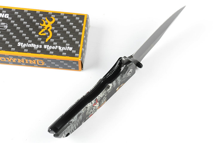 勃朗宁DA80-1快开折刀 全长:22..5cm 刃长:10cm 刃宽:2.8cm 刃厚:0.38cm 柄长:12.5cm 刃材:440 硬度:57HRC 柄材:全钢+表面三D打印图案 锁型:线锁 刀净重:235克 总重量:265克(含纸盒) 其它:原厂彩盒包装