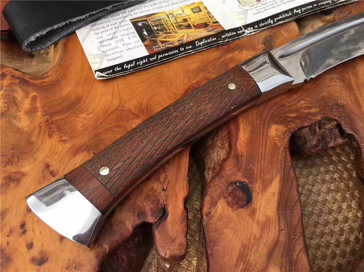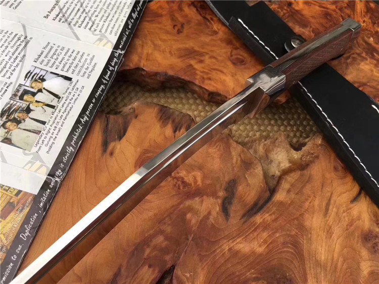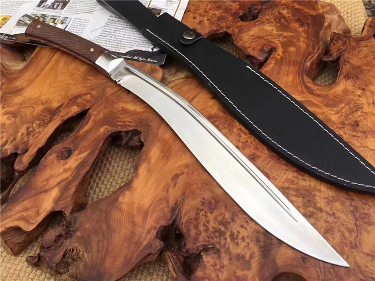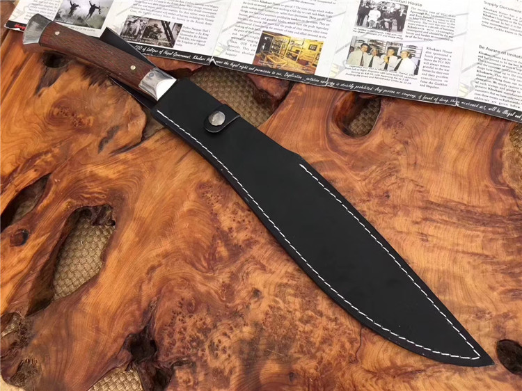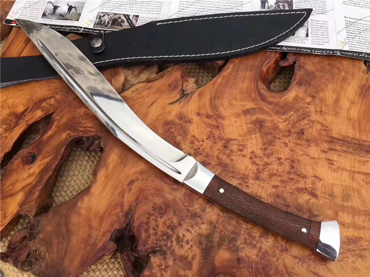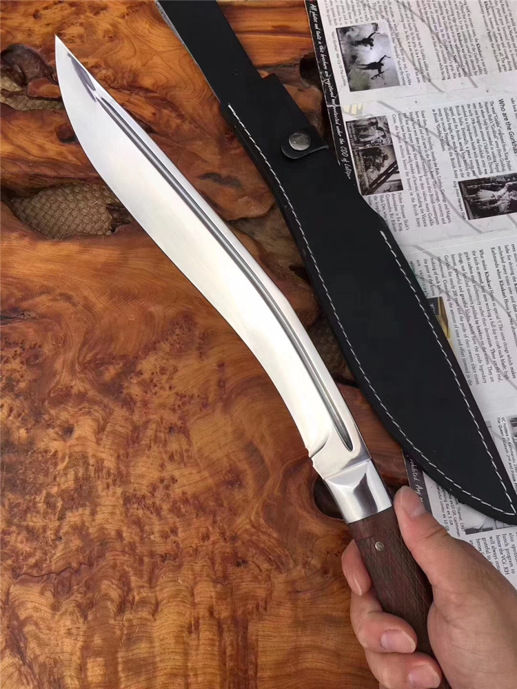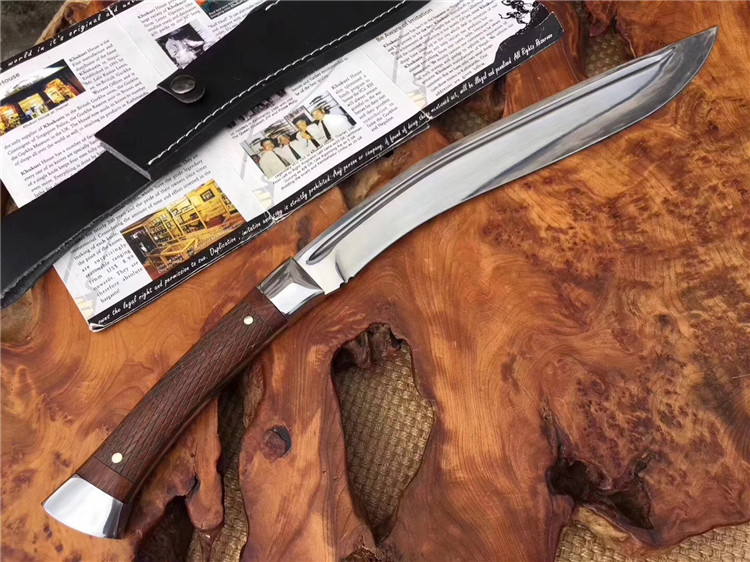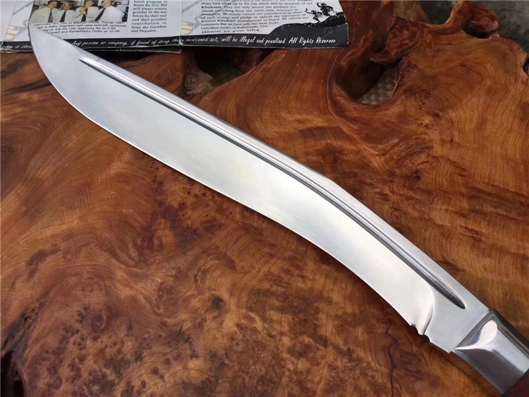 尼泊尔进攻狗腿弯刀 总长:48cm 刃长:36cm 柄长:12cm 厚度:6mm 硬度:60-61 钢材:进口高碳钢 柄材:黑檀木 表面:超镜光(一体龙骨) 重量:380g 总重量含包装:490g 刀鞘:牛皮刀鞘 尼泊尔武士,目前尼泊尔廓尔喀弯刀领域唯一一款限量版弯刀,将日本武士刀的修长刀身与廓尔喀弯刀的力学反曲刃完美的融合在一起,使用进口钢铁工业(进口高碳钢)由尼泊尔最知名的弯刀生产商KHUKURIHIUSE公司多名资深老匠设计,代表着目前廓尔喀弯刀制刀领域的最高水准