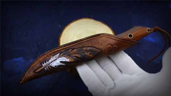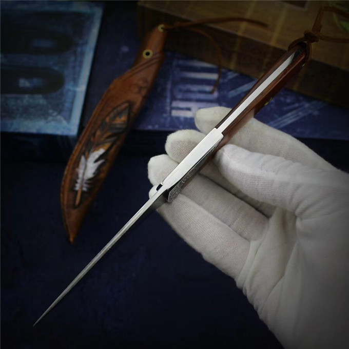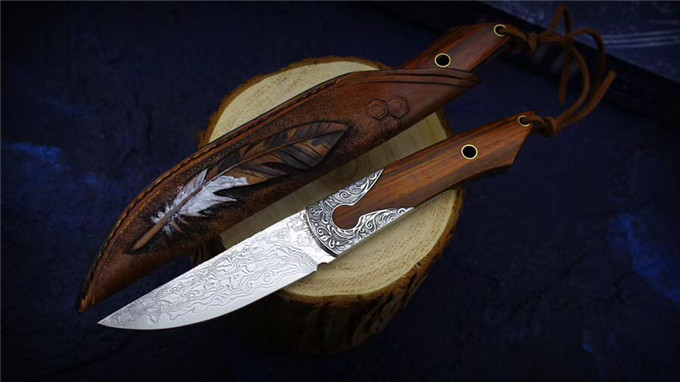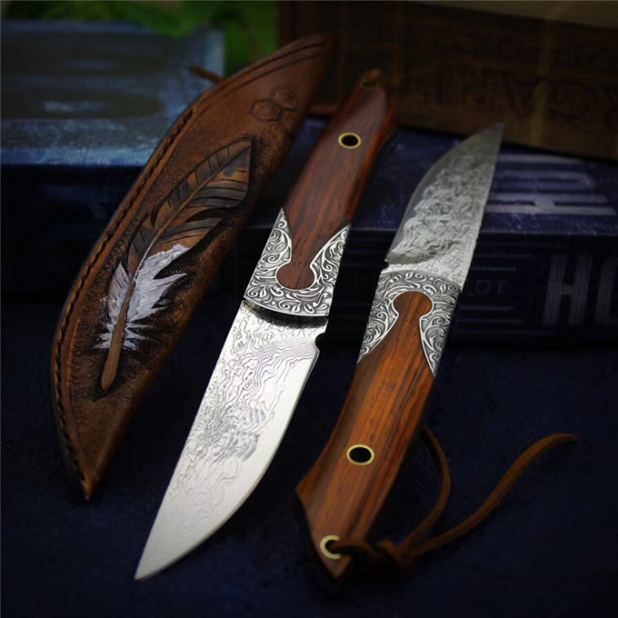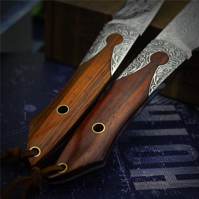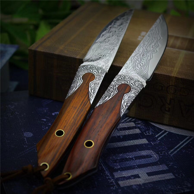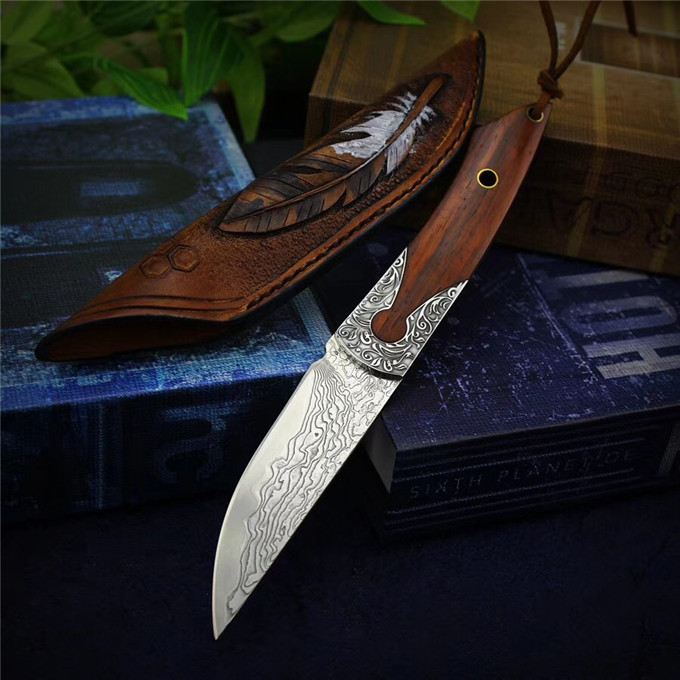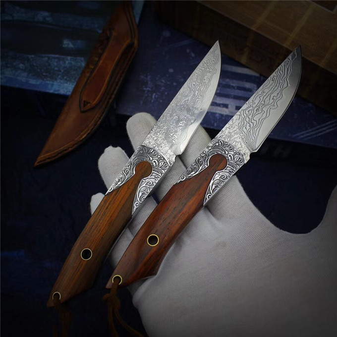大马士革花田洋系列守直刀 全长:19cm 刃长:8.5cm 柄长:10.5cm 刃材:大马士革钢 刃厚:3mm 硬度:60HRC(经多道工序处理) 柄材:雕花复古钢头+印度微粒黄檀木
