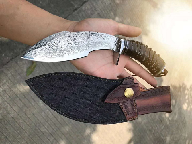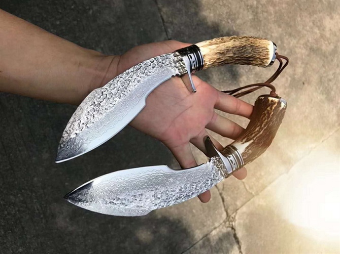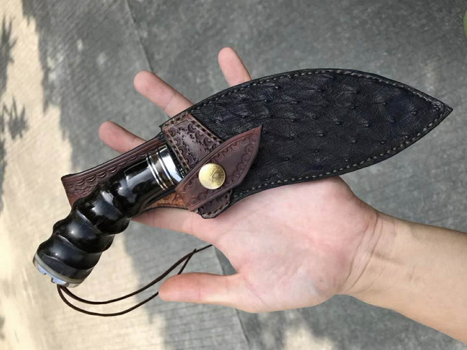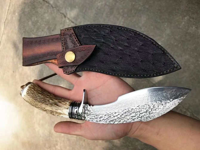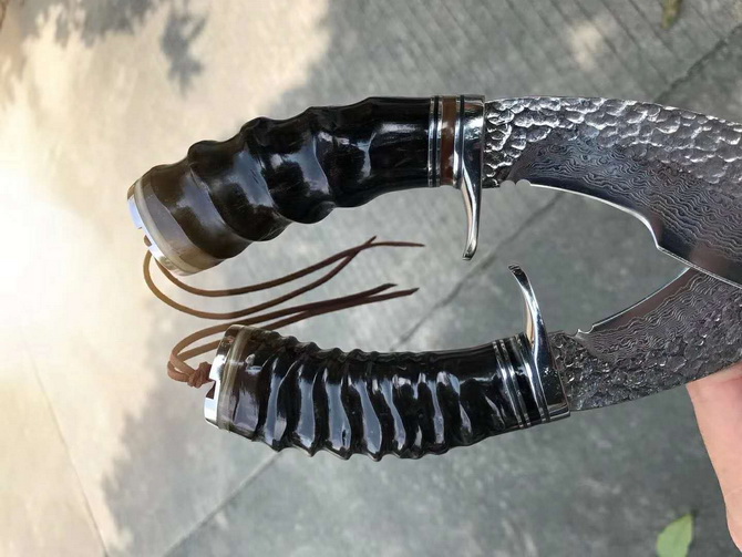 2种柄材质,分别是野生鹿角与野生黑羊角天然材质制作,手工制作帮忙保留粗旷锻打凹凸纹理质感,体现强悍粗旷大气实用性!户外来路求生实用性中型狗腿大马士革刀,搭配意大利进口纯手工植鞣皮镶嵌野生鸵鸟脚皮,非常上档次,每一把刀每一个皮套都是独一无二特性,是每一位收藏者必备用刀