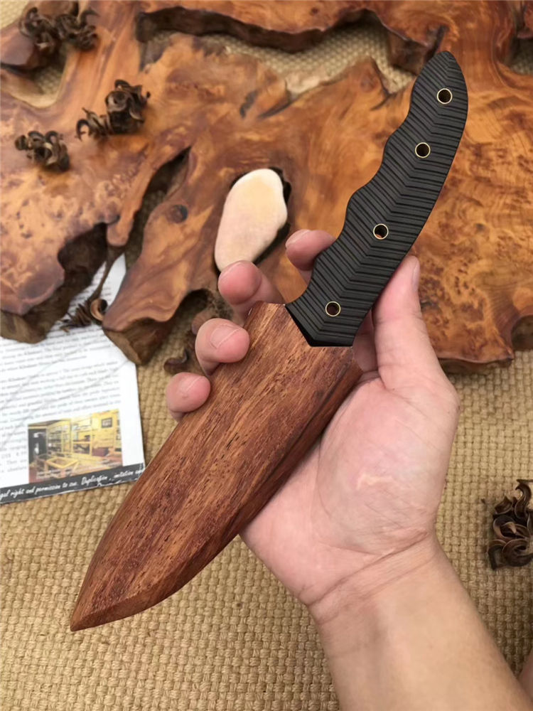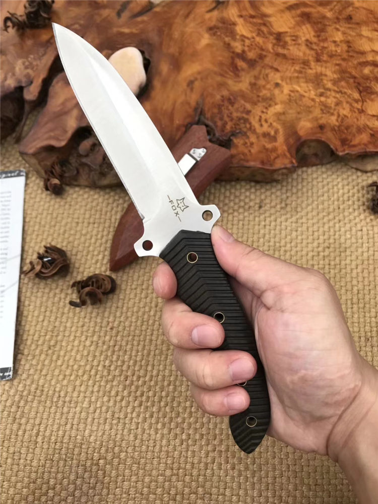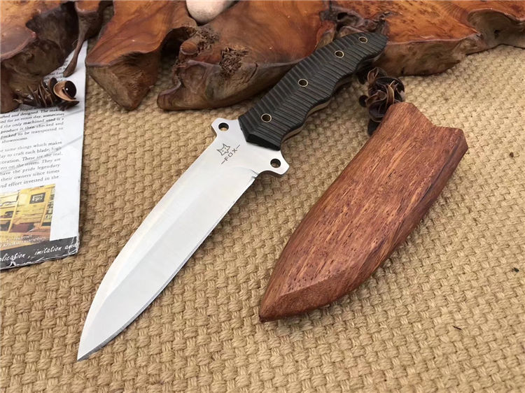 狐狸FOX野芭蕉 全长:25.5cm 刃长:13.5cm 柄长:12cm 刃材:9cr18mov 柄材:黑檀木 刃厚:0.48cm 刃宽:3.1cm 刀鞘:木鞘