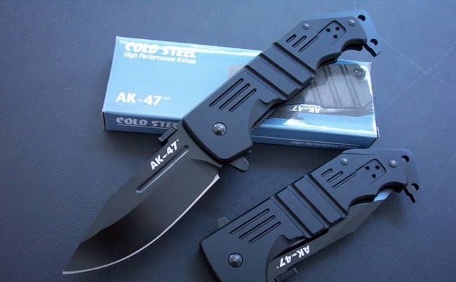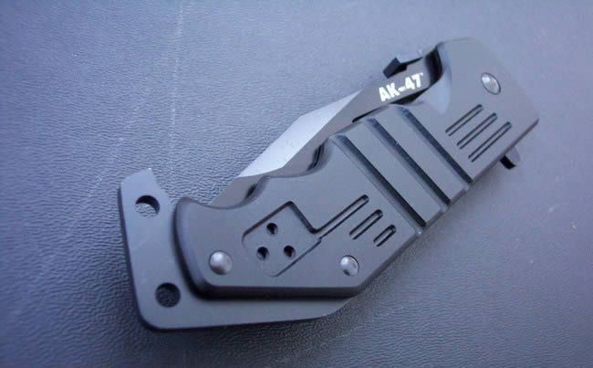 冷钢AK-47战略折刀(半自动) 全长:21.5CM 刃长:8.5CM 刃厚: 0.3CM 刃宽:3.2CM (最宽处) 柄长: 12.8CM(闭合) 柄厚: 1.2CM 涂层:发黑 柄材: 航空铝 净重:150克 锁定:线锁,半自动 其他:带腰夹,可左右手转换
