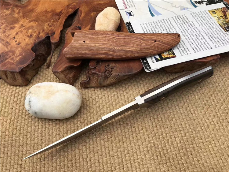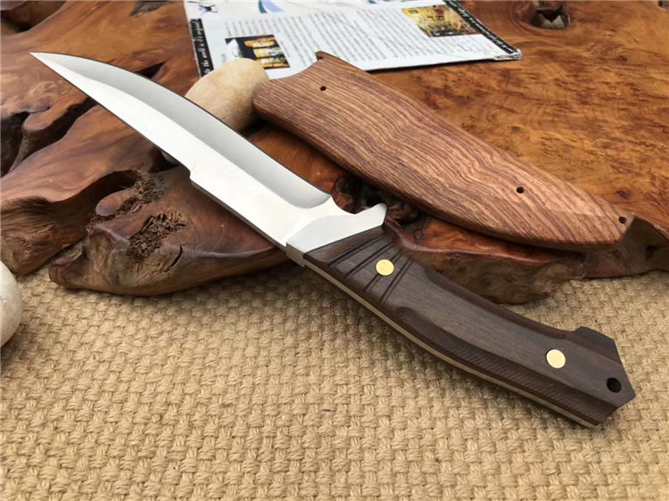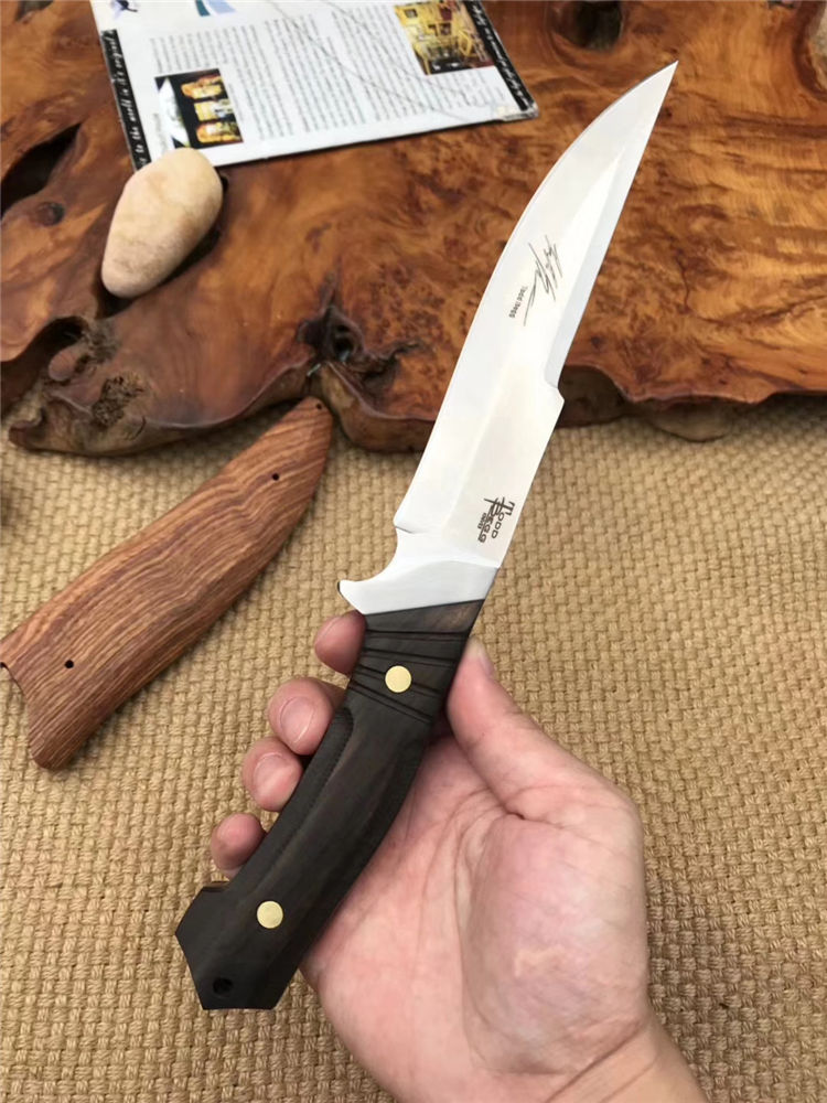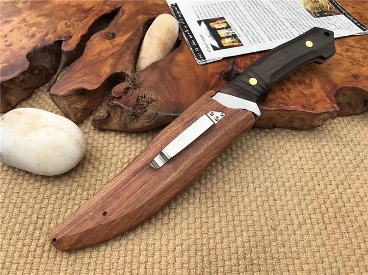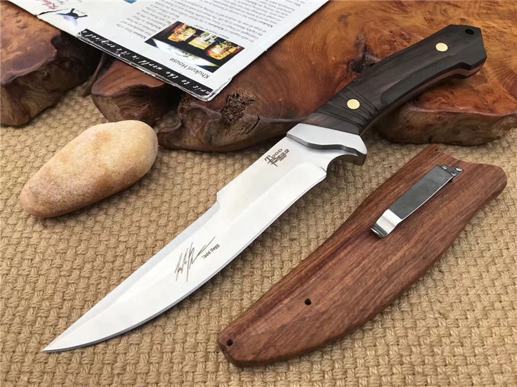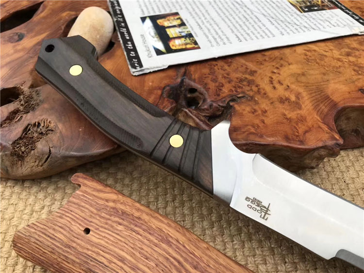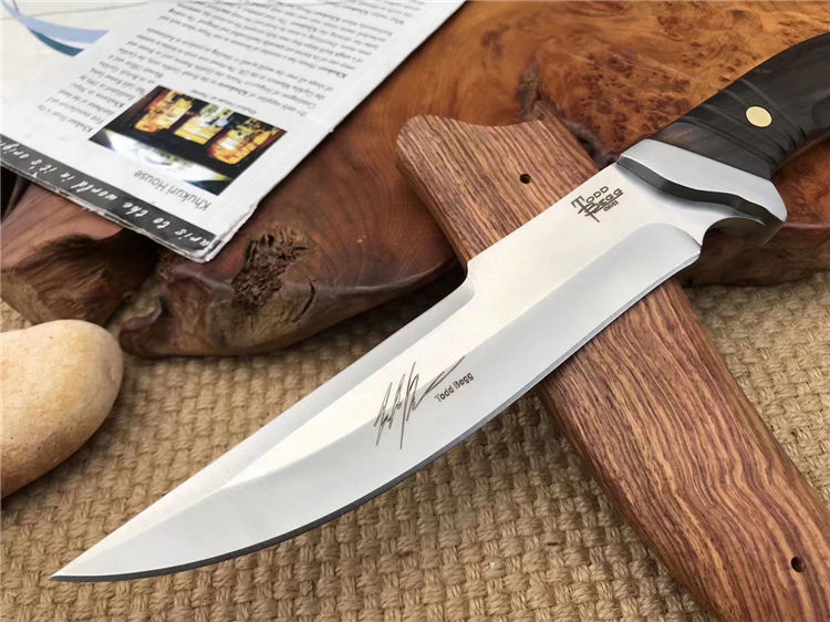 托德贝格寒冰猎刀 全长:29.8cm 刃长:16.5cm 柄长:13.3cm 刃材:9cr18mov 柄材:黑檀木 刃厚:0.48cm 刃宽:3.2cm 刀鞘:木鞘