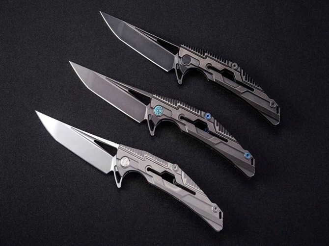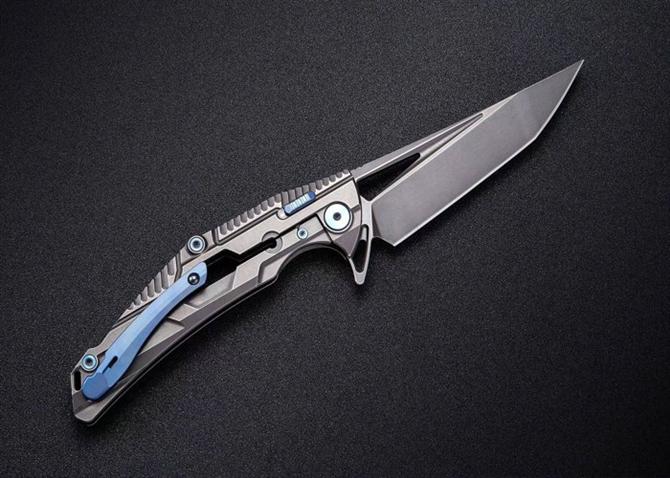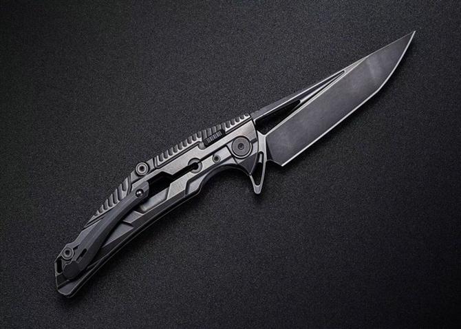 RIKEKNIFE新款M2机械设计战术折刀 型号:M2 全长:22.5cm 刃长:10cm 厚度:5mm 刃材:S35VN 柄材:钛合金 重量:143g 轴承快开 颜色:黑色石洗,深灰色,原色