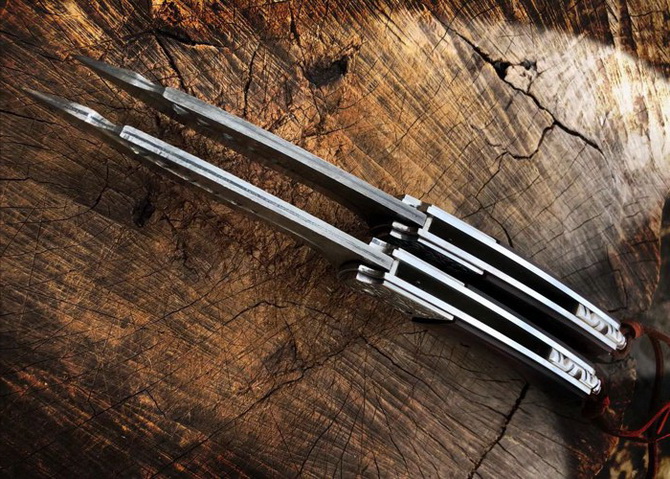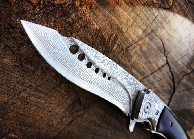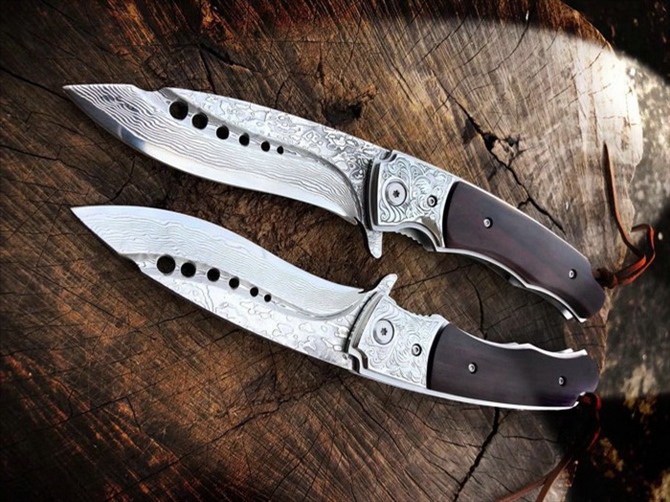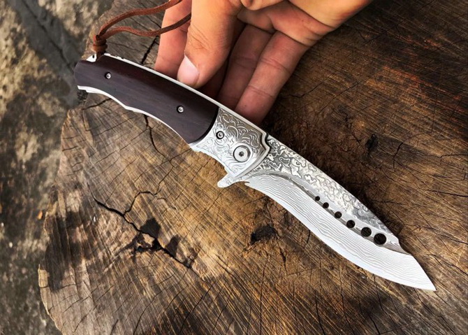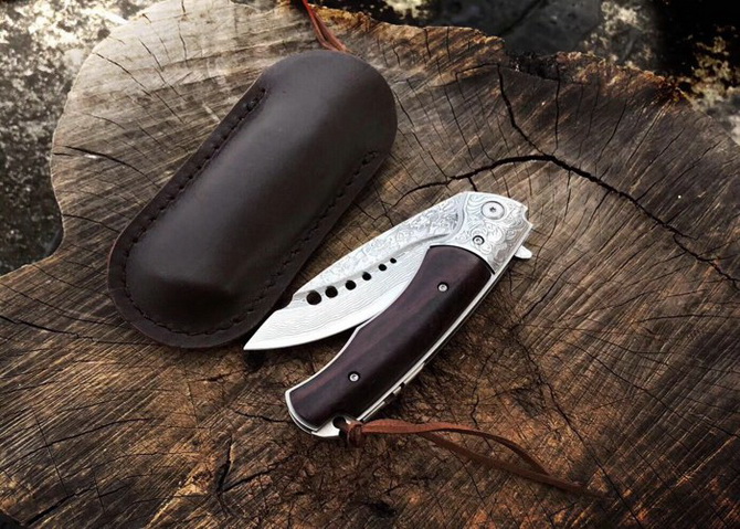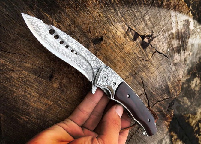 大马士革魅鹰折刀 总长:19.8CM 刃长:9CM 折长:11.3CM 刃材:大马士革钢 硬度:59-60HRC 刃厚:3.2MM 刃宽:2.2CM 柄材:440钢片雕唐草+老料大叶紫檀木 净重:160g