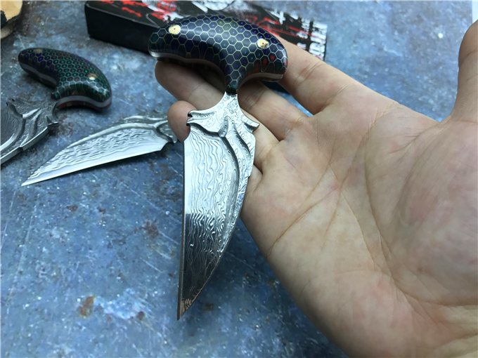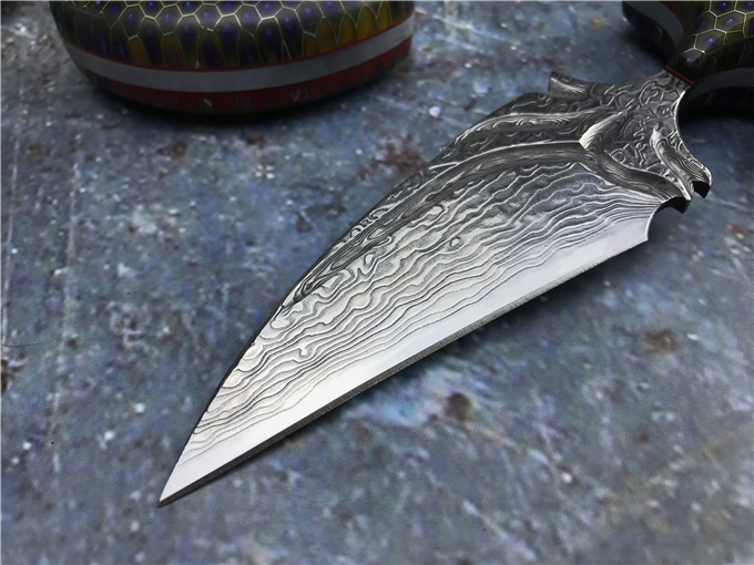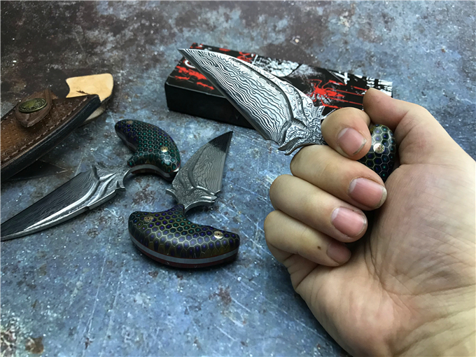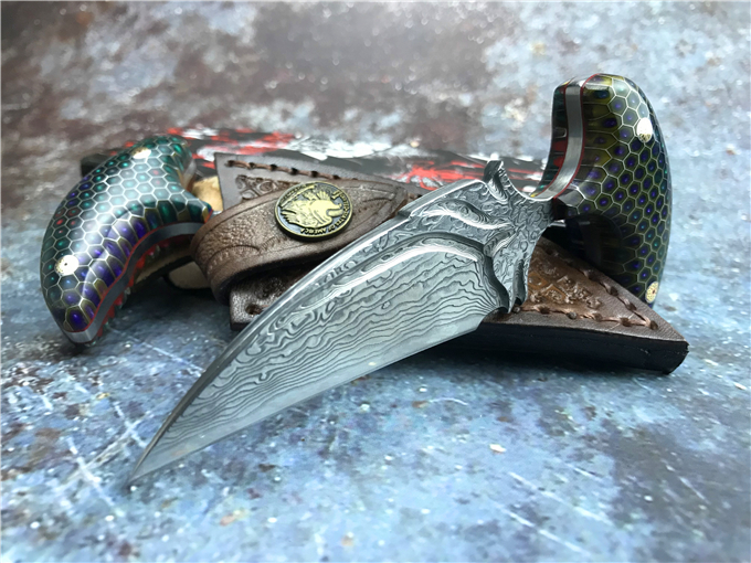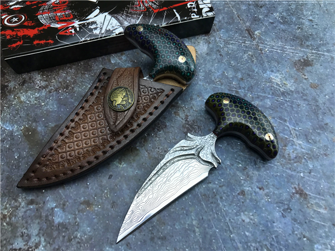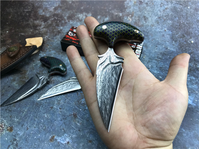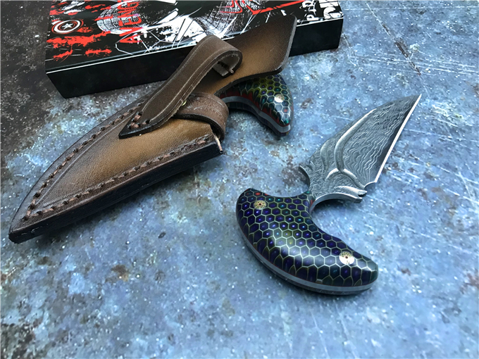 大马士革蜂窝柄富贵叶二代手刺 全长:13CM 刃长:8CM 刃宽:3CM 钢材:日本夹层大马士革钢(VG10)钢芯 硬度:59-60HRC 热处理:真空热处理 柄材:七彩蜂窝柄 注:每把刀柄都是独一无二的,颜色各有差异,随机发货 皮套:意大利进口植鞣手工雕花皮套(纯收工制作雕花缝线) 作用:日常把玩,户外求生防身,开快递包裹,收藏把玩,欣赏 大师设计作品高端袭击,纯手工制作完成、看图做工细节非常精致、边角修磨完美无暇