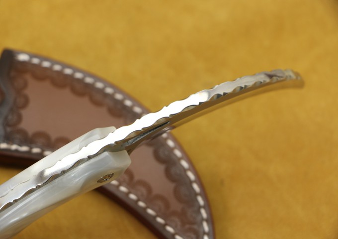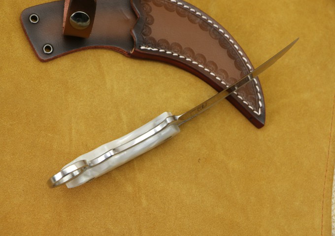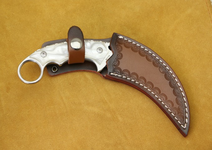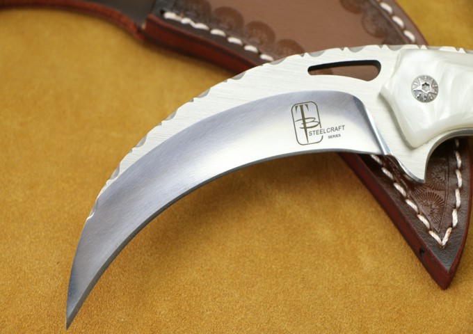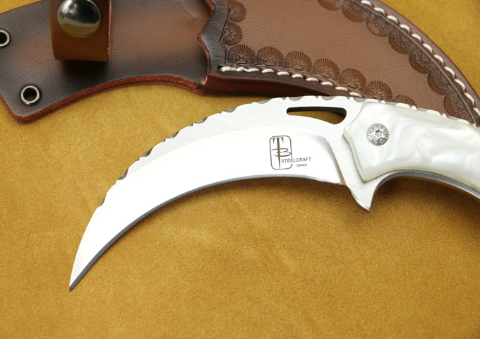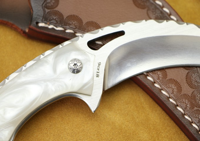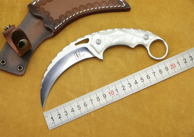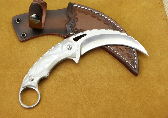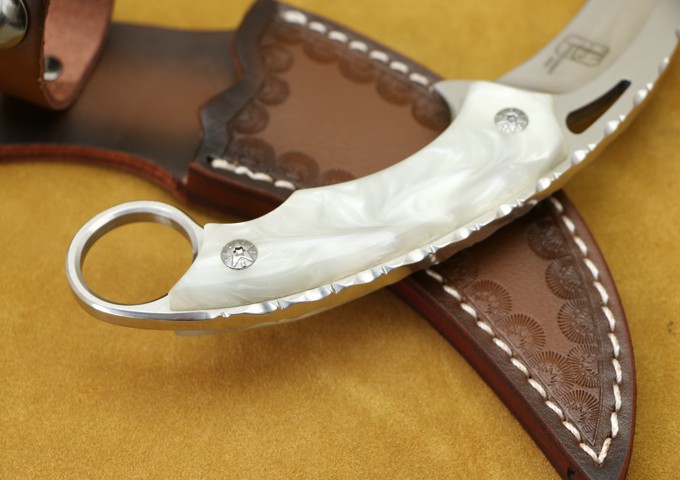 托德贝格魔鸟防卫爪刀 柄材:亚力克 全长:205MM 刃长:107MM 刃厚:5.0MM 硬度:59-61HRC(真空油淬热处理+回火2次) 刃材:9cr18mov 重量:300克 刀刃表面处理:镜光+拉丝 刀套: 优质牛皮套 包装:黑色礼品盒