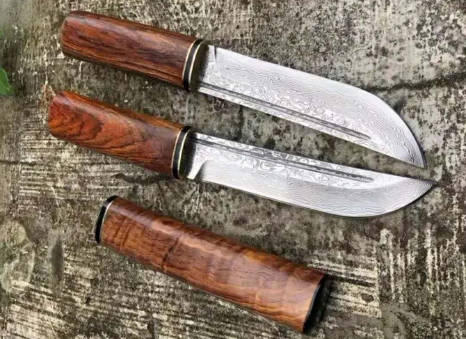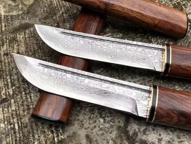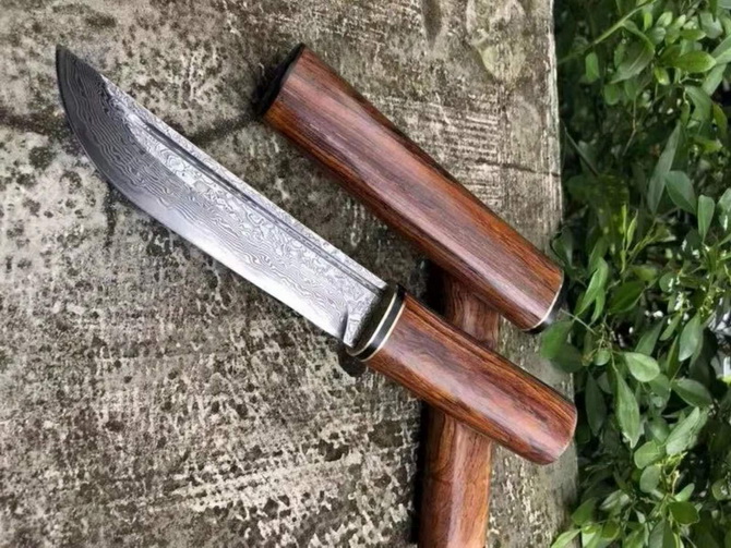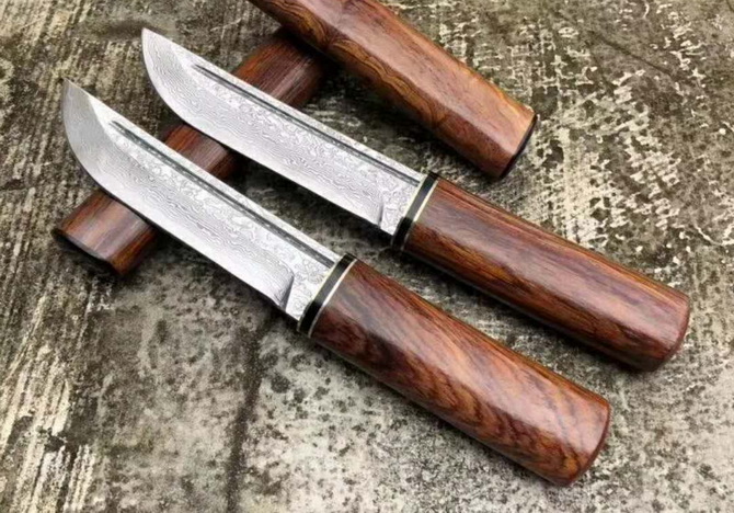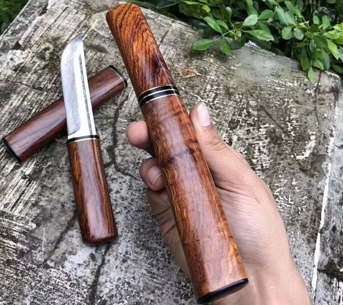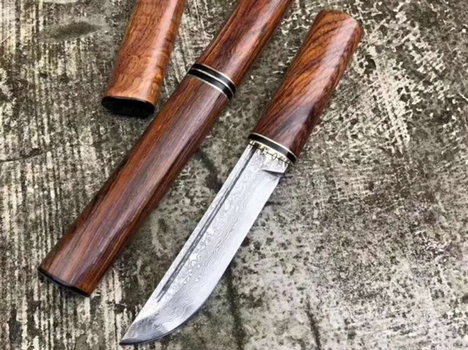 大马士革日式随身小武士刀 总长:22.5cm 刃长:12cm 手柄:10.5cm 刃宽:2.5cm 刃材:大马士革钢 硬度:60HRC 手柄:进口印度黄檀木