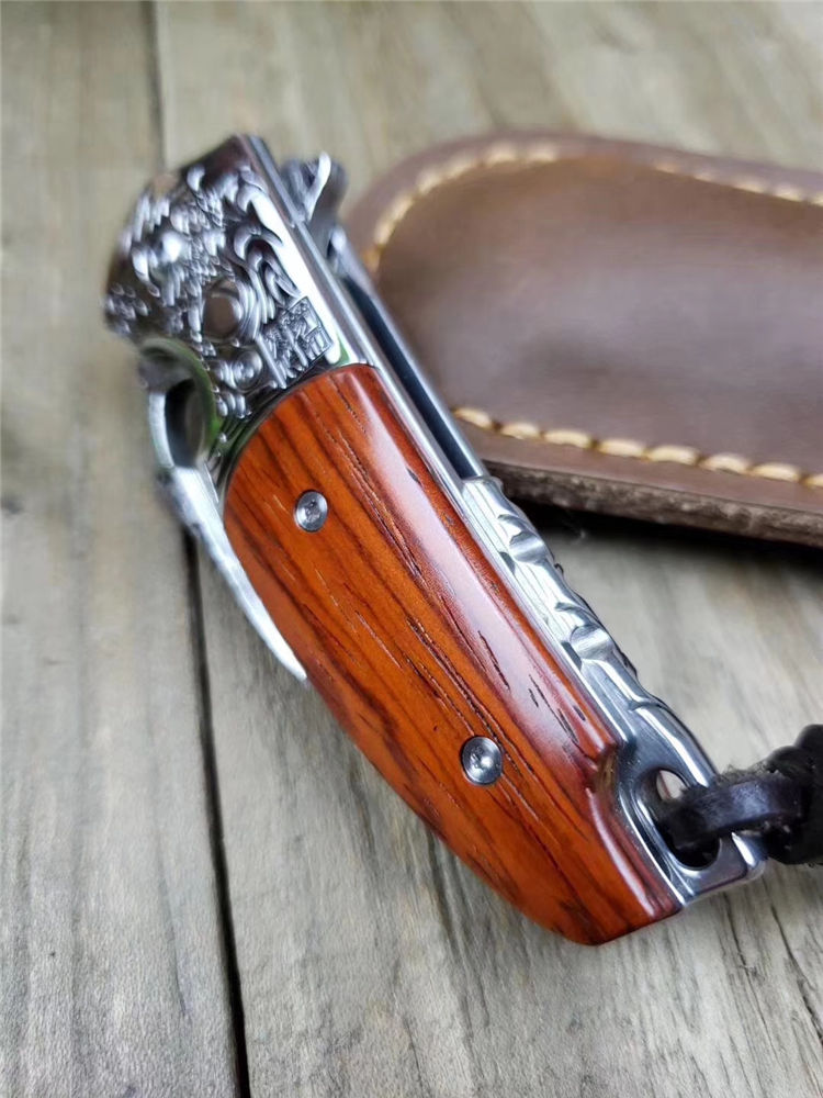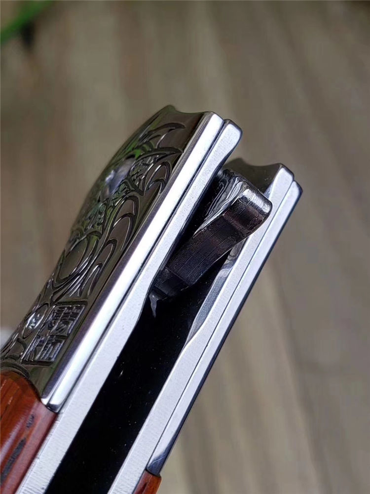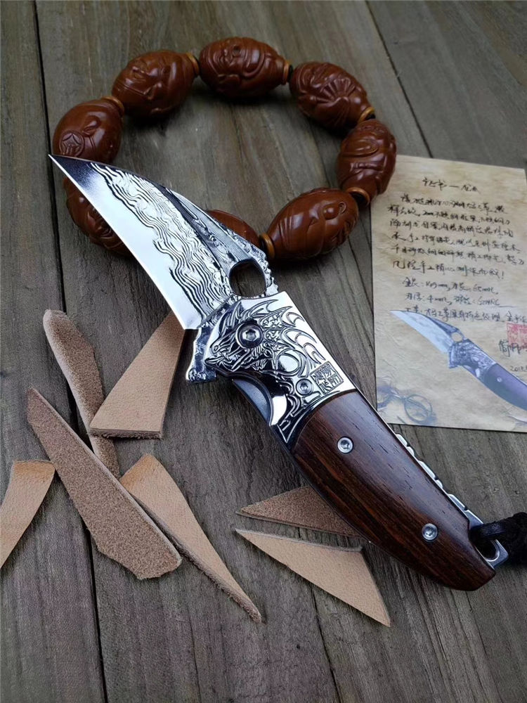 轴承快开折刀/原装正品简师傅作,此款折刀设计突破常规,把爪刀元素完美融入折刀结构,整体S型外观炫酷无比,刀刃选用VG10刃钢大马士革锻打祥云纹,厚度达4mm,更是坚固而强悍,不锈钢刀隔刻龙图腾,封背手工镂花,刀柄精选老料黄檀木,主轴镶嵌高精度滚珠轴承,一体快开设计,开合快速顺滑,手感细腻,随刀赠送简师傅收藏证书、手工缝制皮套、复古礼盒包装。龙爪整体风格独特,做工精致细腻,大小适中,日常携带方便,收藏把玩与实用兼备,是一把难得精品之作
