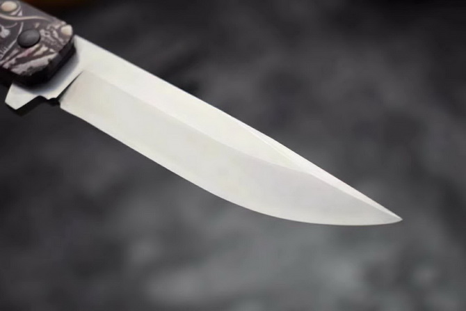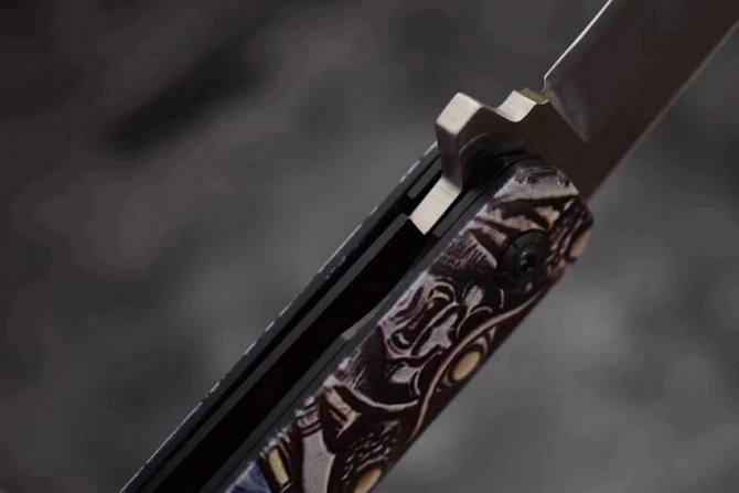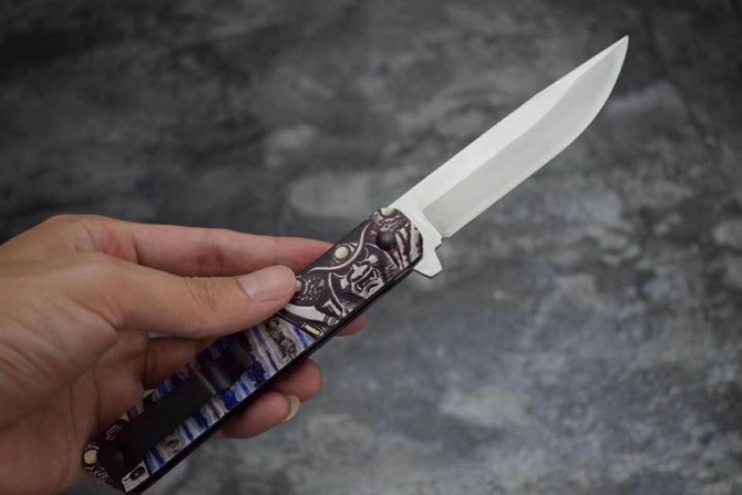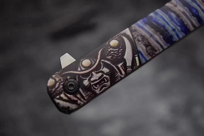 苏科特鬼武士折刀 类型:折刀 全长:22cm 刃长:9.5cm 柄长:12.5cm 刃厚:0.46cm 刃宽:2cm 刃材:9CR18MOV 柄材:钢片+3D打印 硬度:58HRC 净重:210g 表面处理:砂光 锁定;线锁
