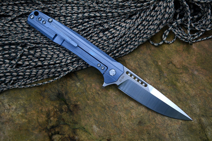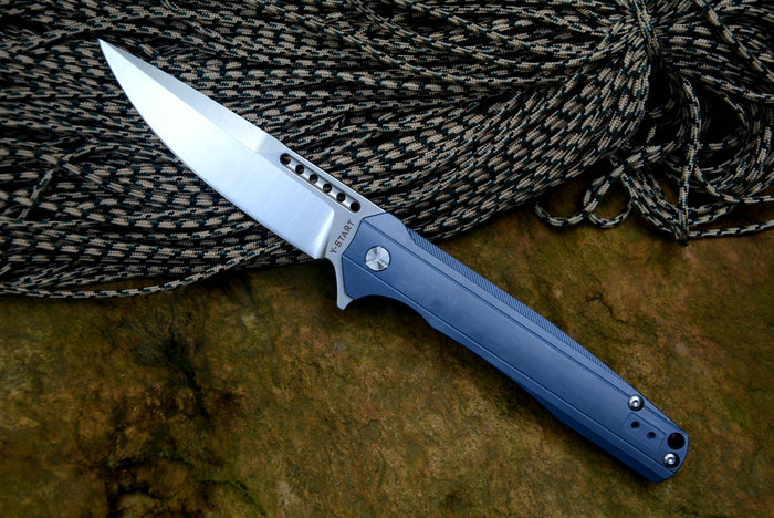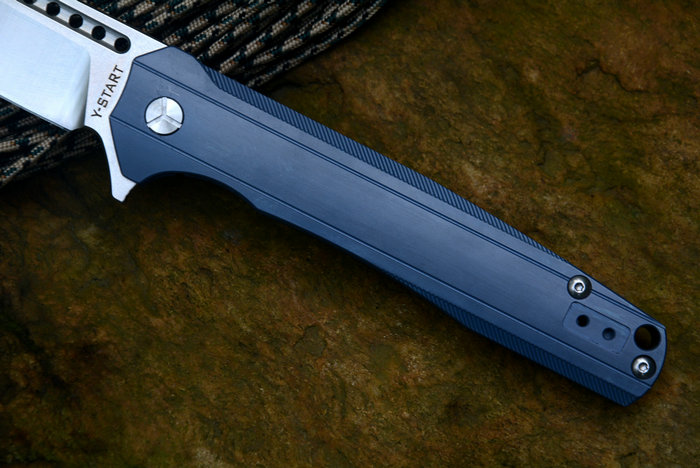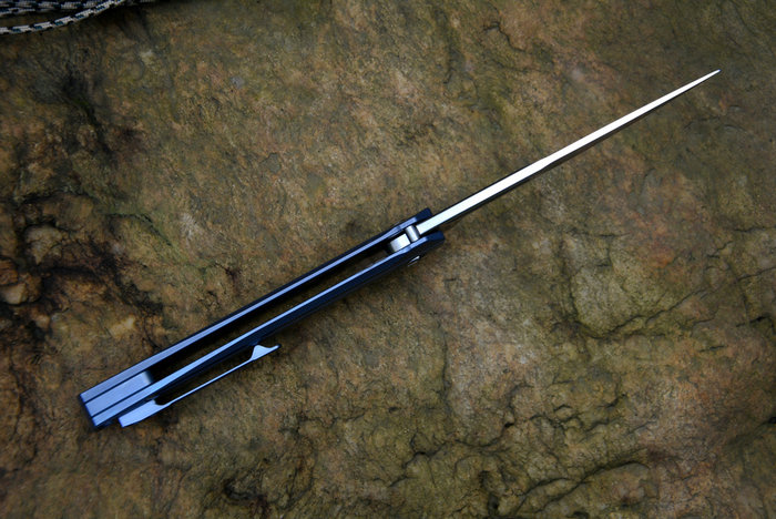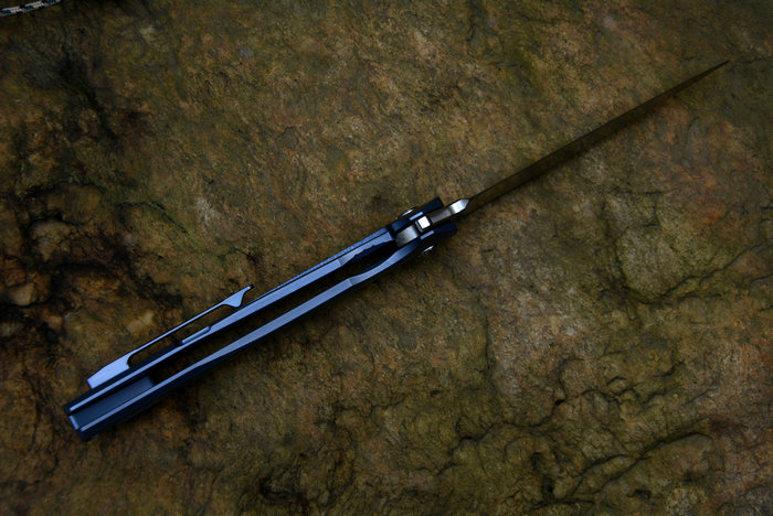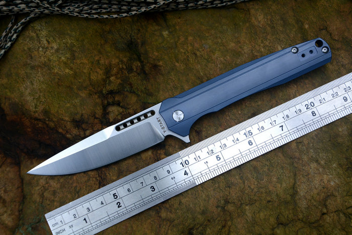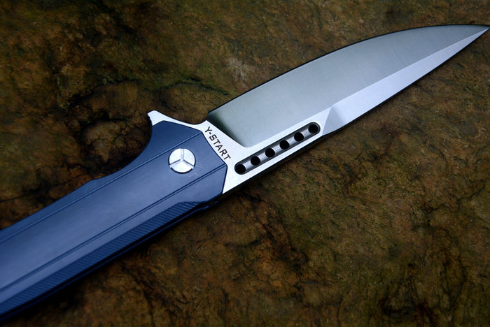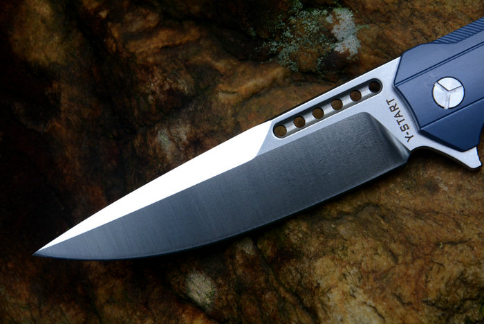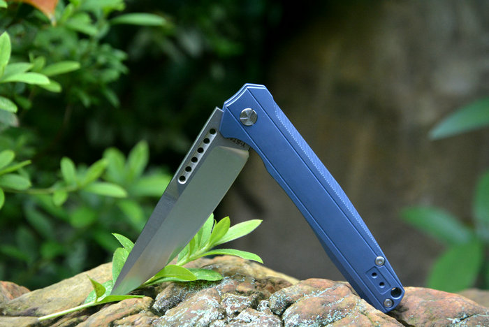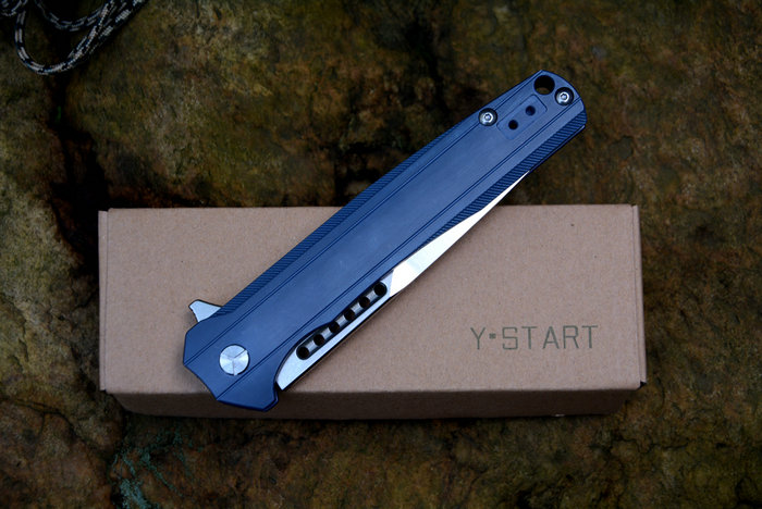 Y-START(随风版)LK5015快开折刀 总长:227mm 刃长:99mm 柄长:128mm 刃厚:4.0mm 刃宽:26mm 刃材:VG-10(真空处理) 刀刃处理:石洗后CNC数控磨 硬度:HRC60-61 柄材:TC4钛合金(镀蓝色) 净重:135g 包装:褐色硬纸盒