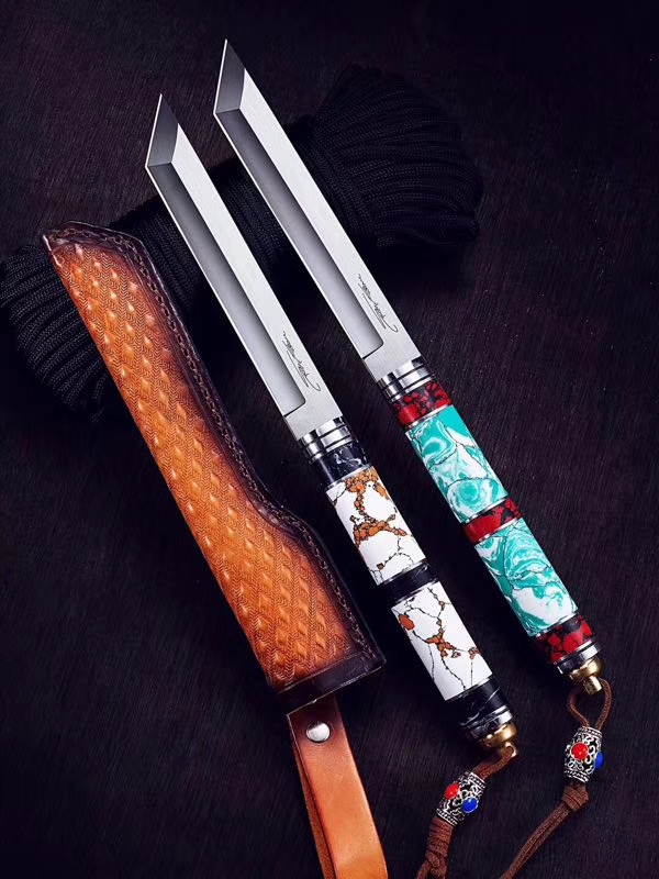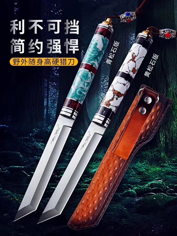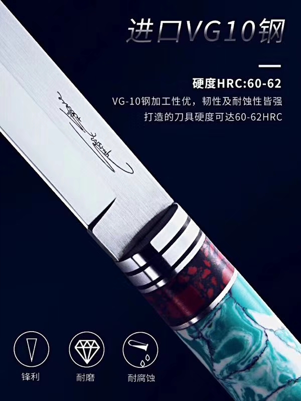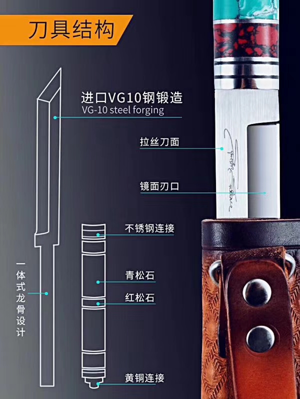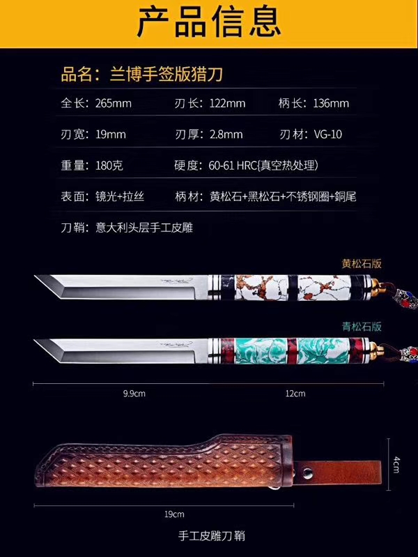 兰博手签版猎刀 全长:265mm 刃长:122mm 柄长:136mm 刃宽:19mm 刃厚:2.8mm 刃材:VG-10 重量:180克 硬度:60-61HRC{真空热处理) 表面:镜光+拉丝 柄材:黄松石+黑松石+不锈钢圈+銅尾 刀鞘:意大利头层手工皮雕
