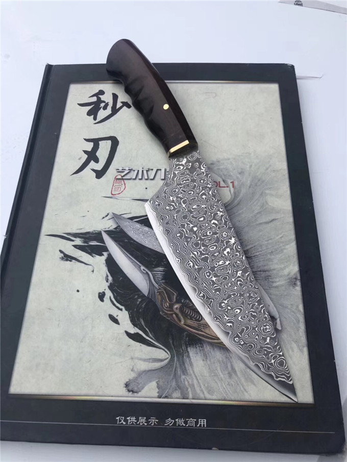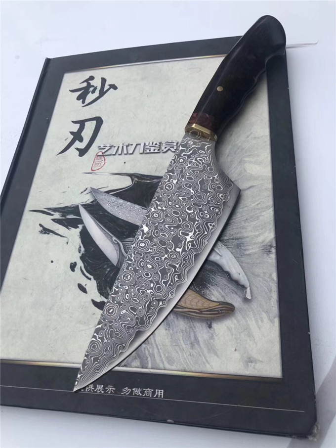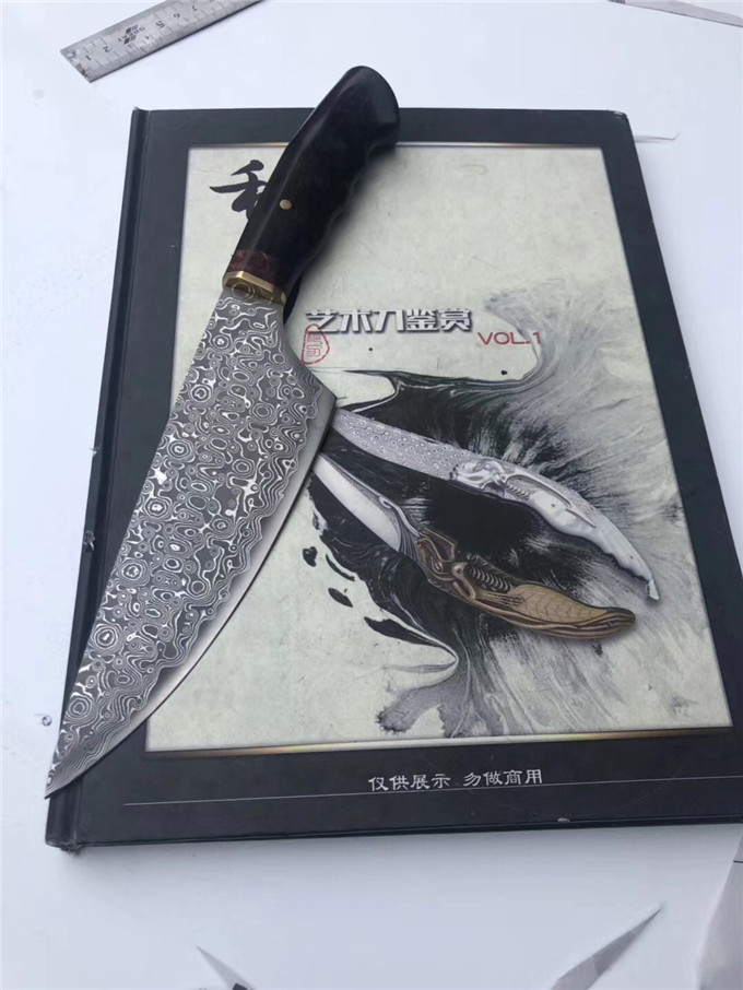 大马士革手工厨房刀 全长:30cm 刃长:18cm 宽:5.5cm 硬度:60度 厚度:0.3cm 花梨瘿木黑酸枝木组合手柄,VG10大马士革钢、极度锋利,真空热处理浸油