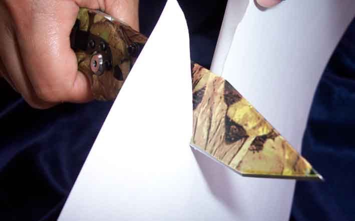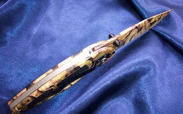 全长:20.5 刃长:8.2 刃厚:0.35 刃宽:2.9 柄材:航空铝 刃材:440 硬度:57 锁定:线锁 刀刃表面处理: 披覆军用迷彩