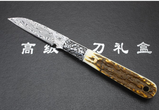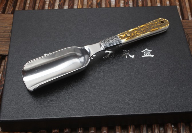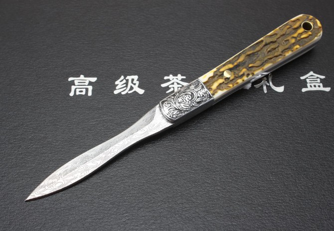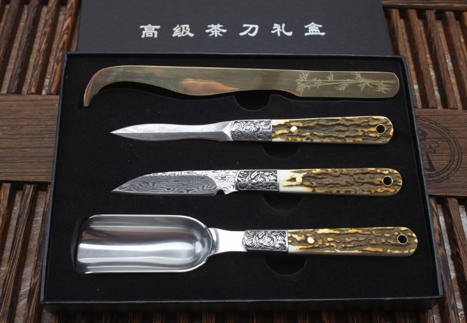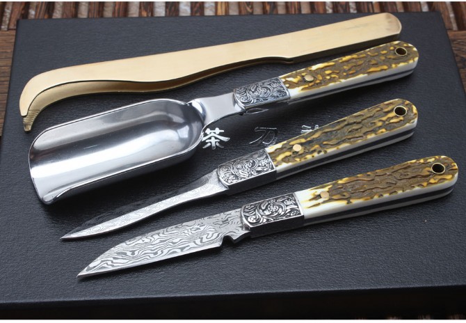 四件套礼盒高级茶刀 茶针全长:155mm 茶刀全长:154mm 茶钳全长:178mm 茶勺全长:176m 刃材:不锈钢+仿大马士革纹 重量:361g(含包装) 硬度:57HRC 表面:仿大马士革纹 柄材:刻花铜头+仿鹿角 锁型:定锁 其他:配礼品盒