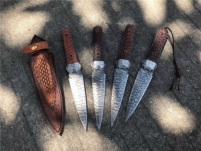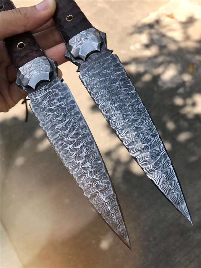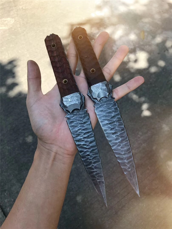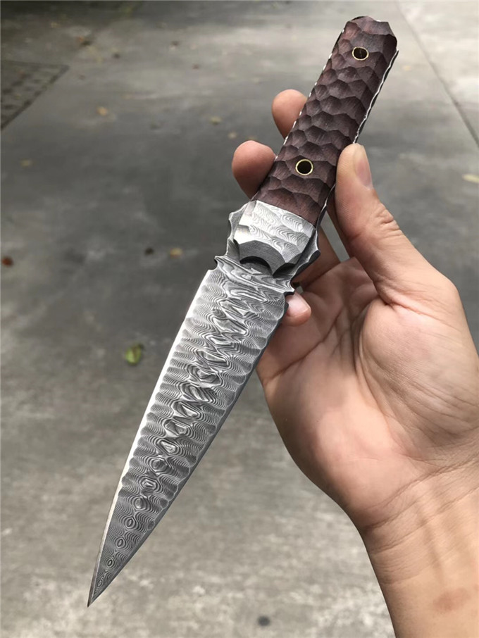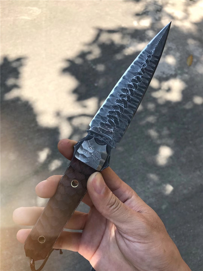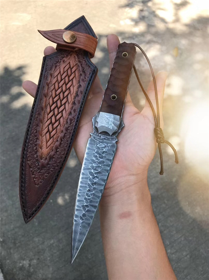 大马士革魔刃神剑石纹款直刀 总长:25.5cm 刃长:12.5cm 刃厚:4MM 刃宽:3.4cm 钢材:进口锻造大马士革钢180层 硬度:59-61HRC,真空热处理 工艺:纯手工制作雕刻 表面效果:做旧沧桑怀旧复古效果 柄材:大叶紫檀 挡手:大马士革钢 皮套:意大利进口优等手工植鞣皮,手工雕花缝线 包装:复古手工盒子