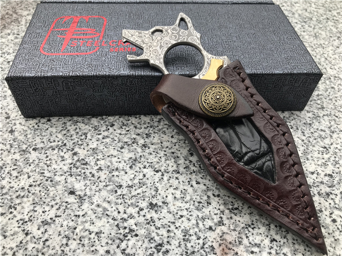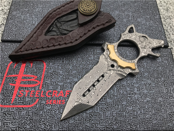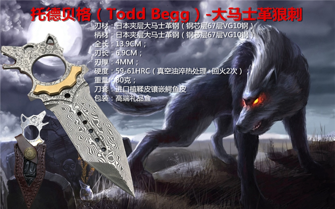 托德贝格是一个非常有想象力和个人风格的刀匠,所有作品都是创新和独特风格的,直刀和折刀双修,功力深厚,在有着cnc技术辅助和个人很强的研磨设计功力基础上,做出了很多好刀,狼刺是begg首款手刺,狼头样子设计,镶嵌着黄铜超强的视觉效果独特而美观。双锋设计加上自己独特风格血槽和孔洞结合起来,非常独特霸气,首批只有100把,手快有,看图做工细节非常精致、边角修磨完美无暇,采用进口大马士革一体龙骨结构设计,非常安全牢固,可以当刀使用又可当防身手刺,搭配进口植鞣皮镶嵌鳄鱼皮的刀套,高端大方,便于携带,在近距离格斗中且具有很强的杀伤力,它是贴身近战中极危险的武器,正所谓一寸短一寸险……放在车里防身,开快递包裹,可当收藏把玩,欣赏,作为礼品送朋友收藏都是极好