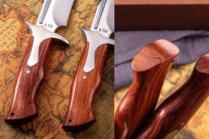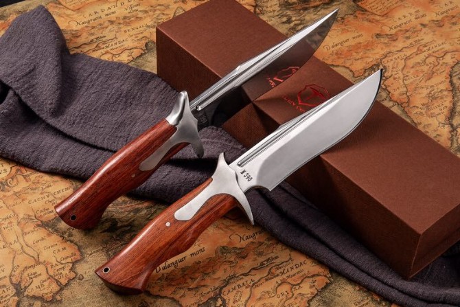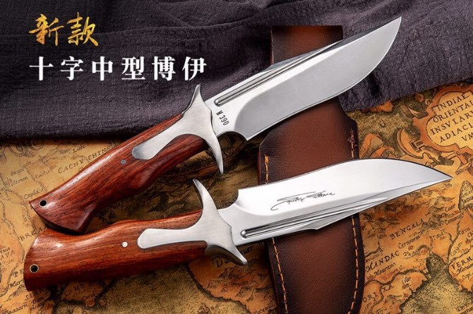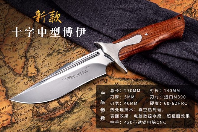 新款十字中型博伊直刀 总长:270MM 刃长:140MM 刃厚:5MM 刃材:进口M390 刃宽:40MM 硬度:60-62HRC 热处理技术:真空热处理 表面效果:电脑数控水磨,超镜面效果 护手:430不锈钢电脑CNC