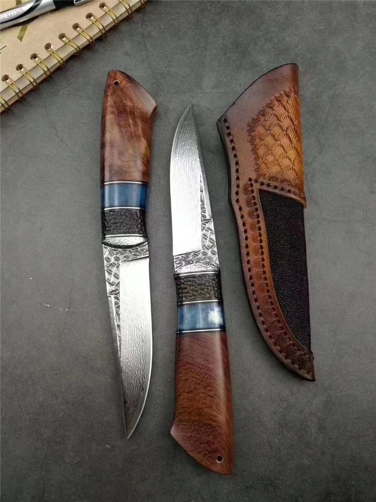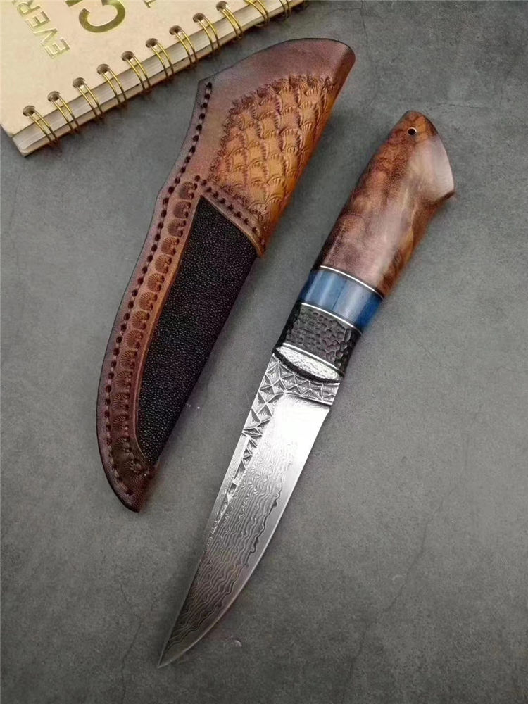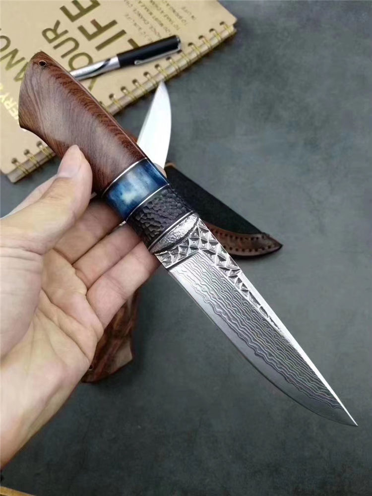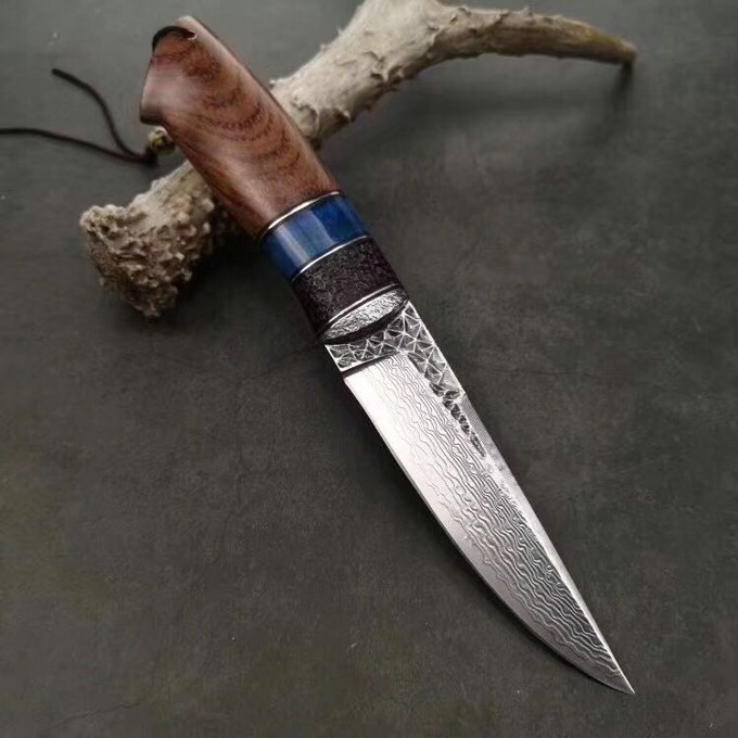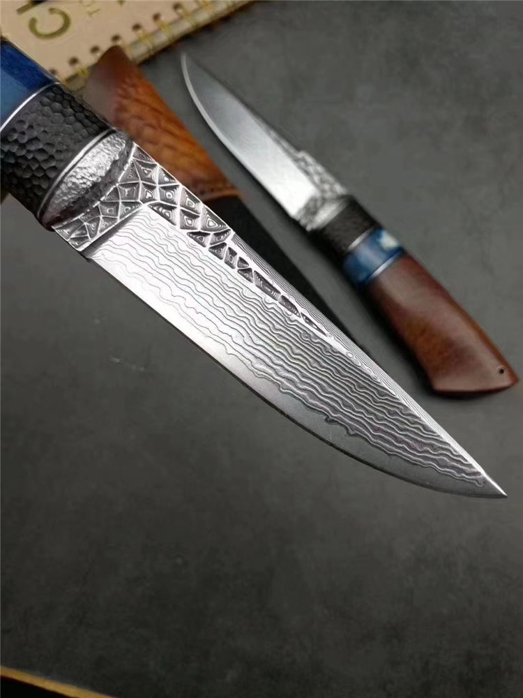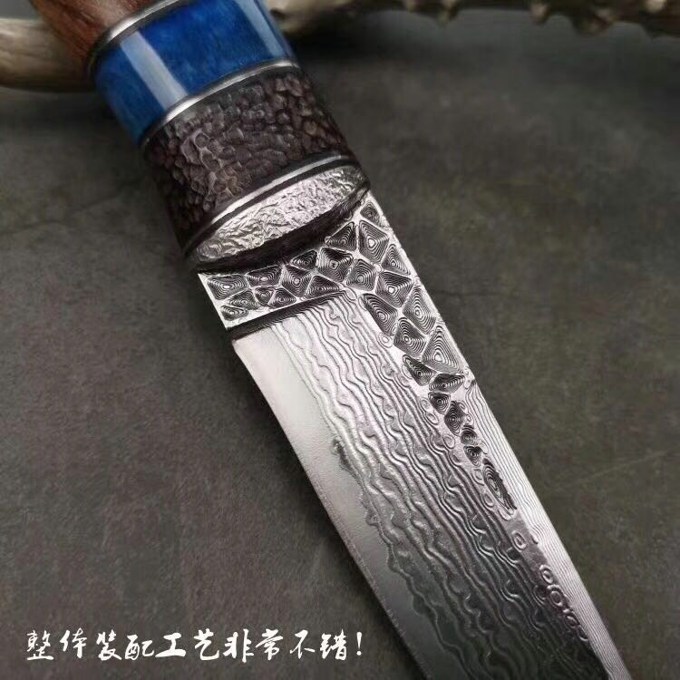 大马士革北极熊直刀 全长:240MM 刃长:120MM 刃宽:29MM 刃厚:3.5MM 净重:约140G(不含皮套) 硬度:59HRC 制作工艺:真空热处理,大师级工匠制作 刃材:VG10芯大马士革钢 柄材:非洲黑檀+扭纹巴花+蓝色兽骨