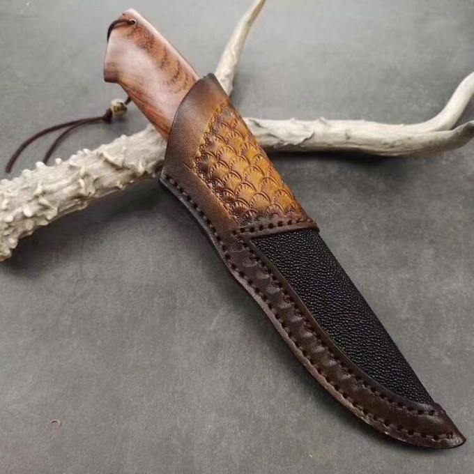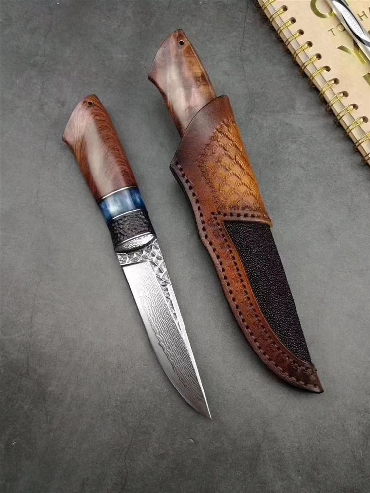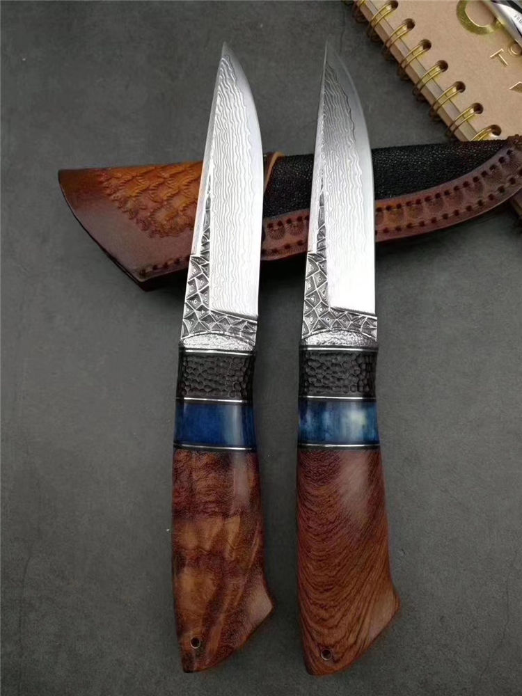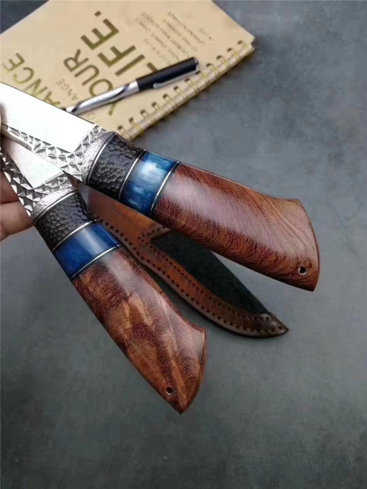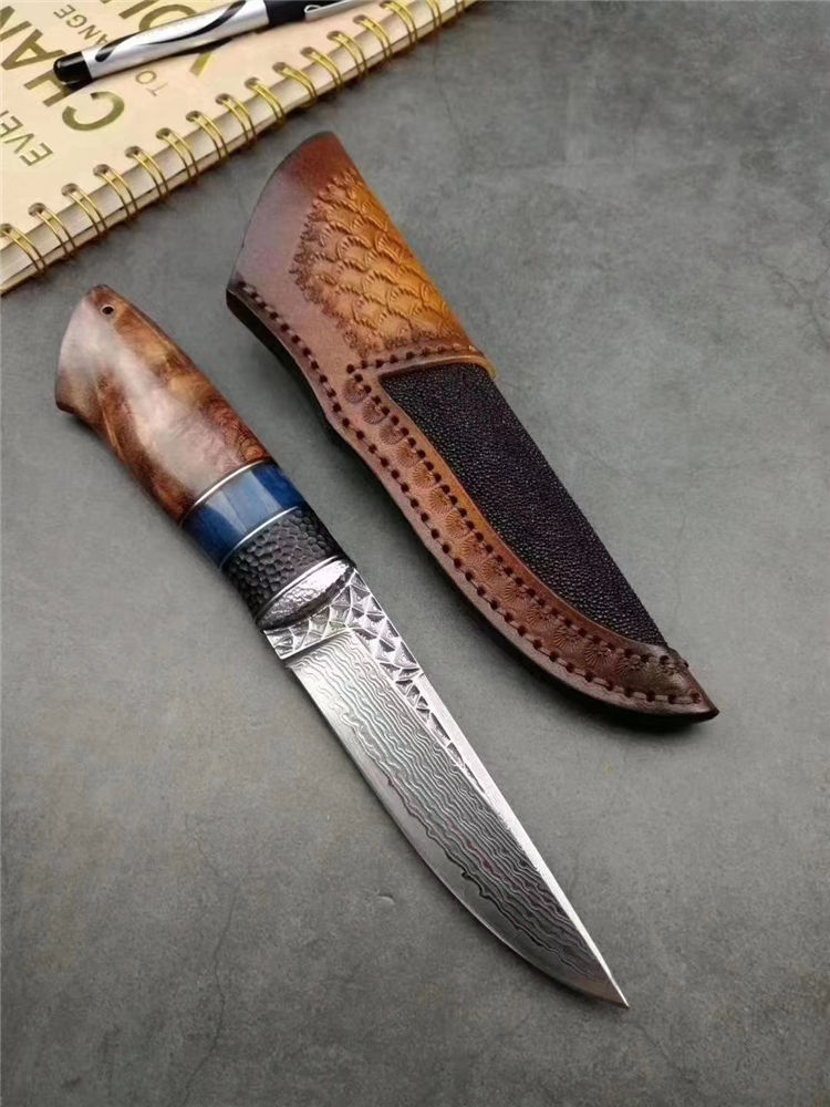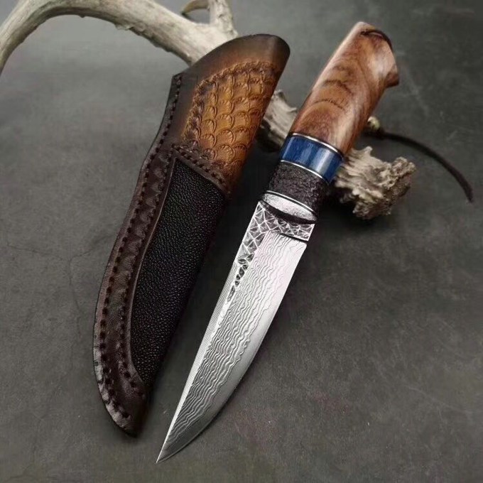 大马士革北极熊直刀 全长:240MM 刃长:120MM 刃宽:29MM 刃厚:3.5MM 净重:约140G(不含皮套) 硬度:59HRC 制作工艺:真空热处理,大师级工匠制作 刃材:VG10芯大马士革钢 柄材:非洲黑檀+扭纹巴花+蓝色兽骨
