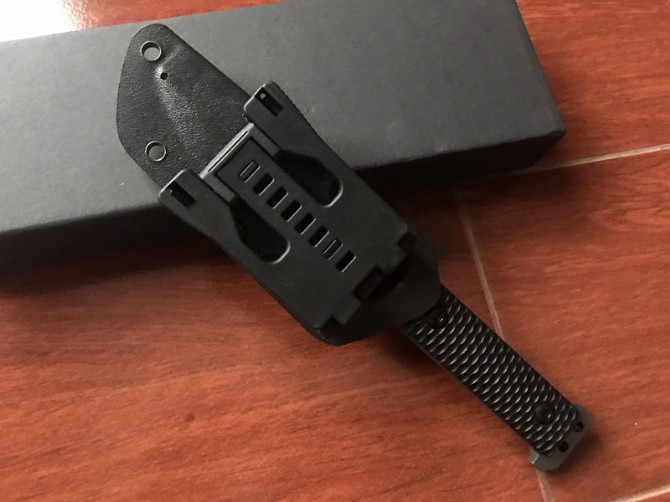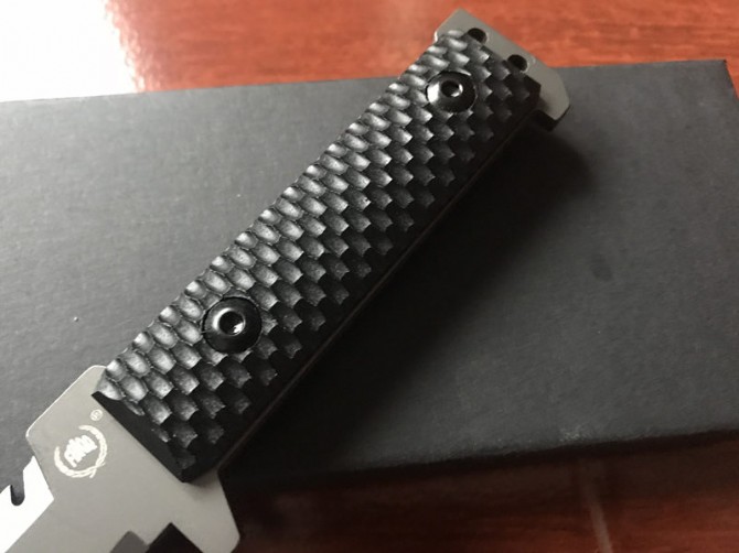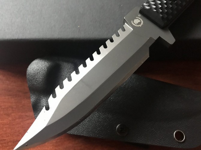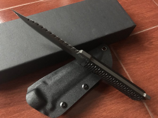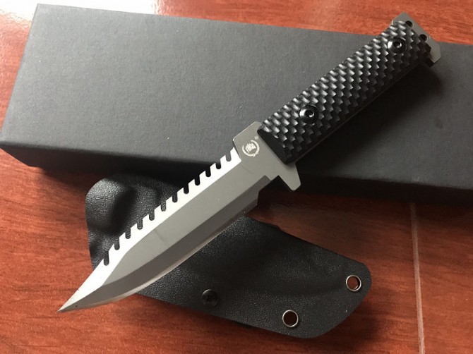 FBI蛟龙直刀 类型:直刀 全长:22cm 刃长:10cm 柄长:9.5cm 刃厚:0.43cm 刃宽:3cm 刃材:5CR15MOV 柄材:防滑G10柄 硬度:57HRC 重量:300克(含包装) 表面处:灰钛 其他:高档硬纸盒和K鞘
