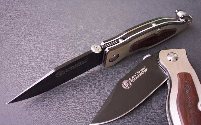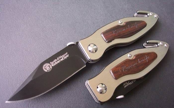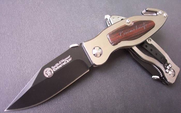 史密斯.威森AT-6救生折刀 全 长: 20cm 刃 长: 8cm 刃 宽: 2.8cm 闭 合: 11.6cm 刃 材: 440 硬 度: 57 表 面: 黑钛 刃 厚: 0.3cm 柄 长: 11.6cm 柄 厚: 1.3cm 柄 材: 精钢,手柄两面分别装镶桃木片和G10片 重 量: 220克 锁 闭: 线锁(坚固), 刀脊有易开关 其 他: 坚固背夹,带救生功能(割带器及撞针) 品 质: 上乘