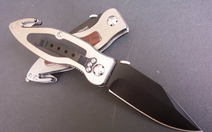 全 长: 20cm 刃 长: 8cm 刃 宽: 2.8cm 闭 合: 11.6cm 刃 材: 440 硬 度: 57 表 面: 黑钛 刃 厚: 0.3cm 柄 长: 11.6cm 柄 厚: 1.3cm 柄 材: 精钢,手柄两面分别装镶桃木片和G10片 重 量: 220克 锁 闭: 线锁(坚固), 刀脊有易开关 其 他: 坚固背夹,带救生功能(割带器及撞针) 品 质: 上乘