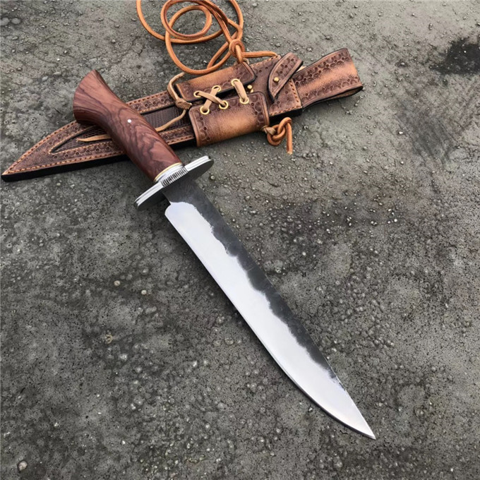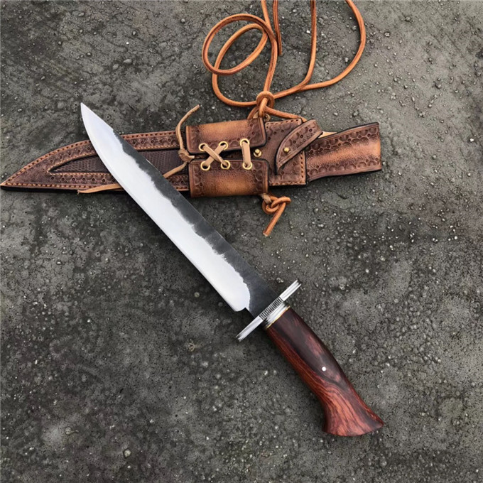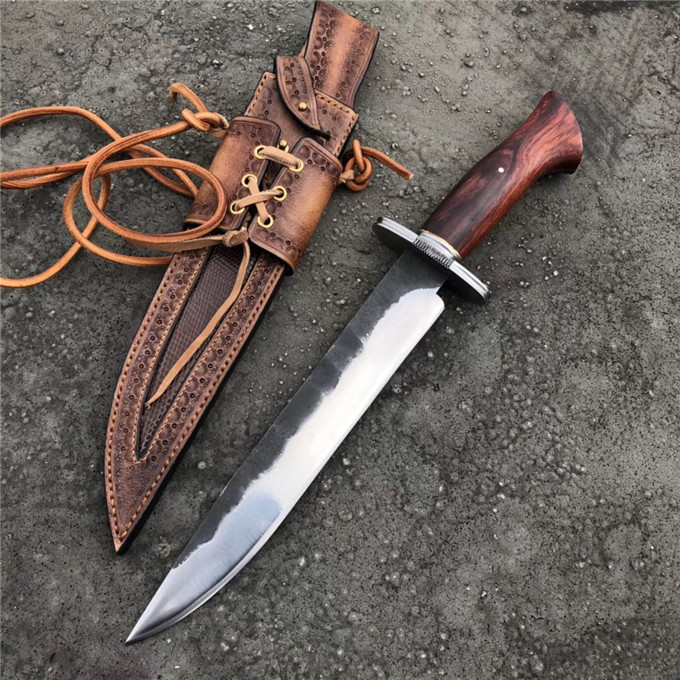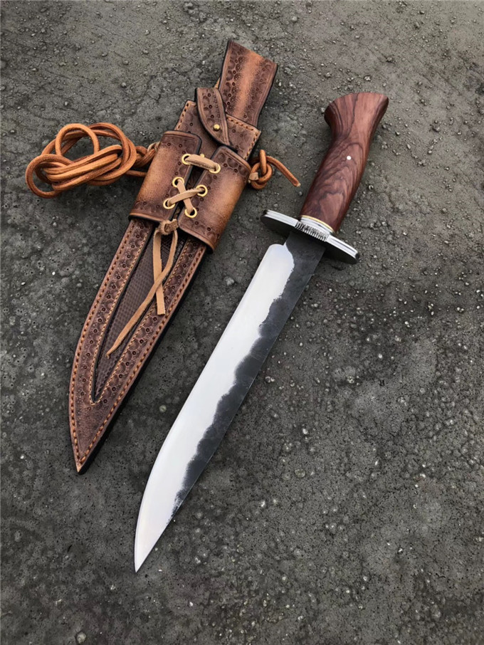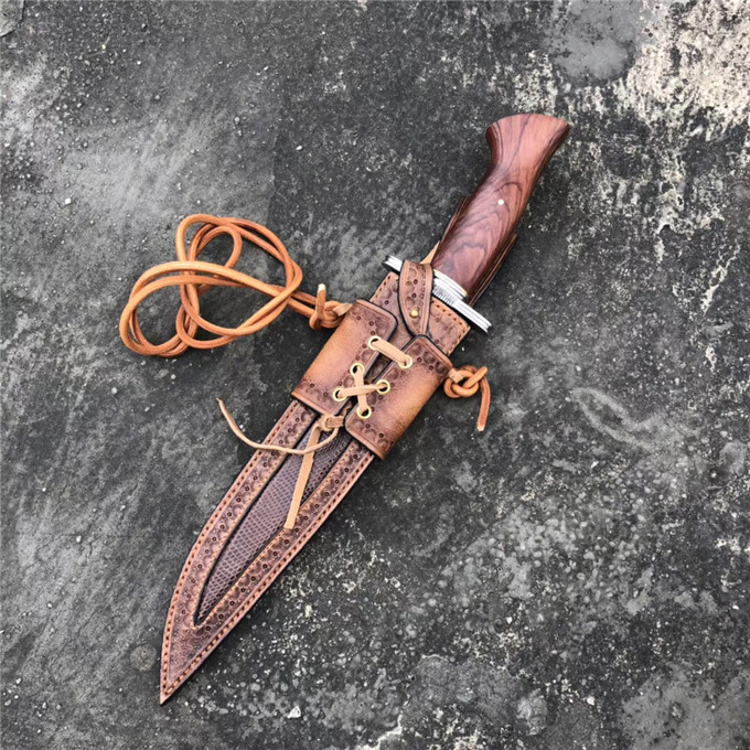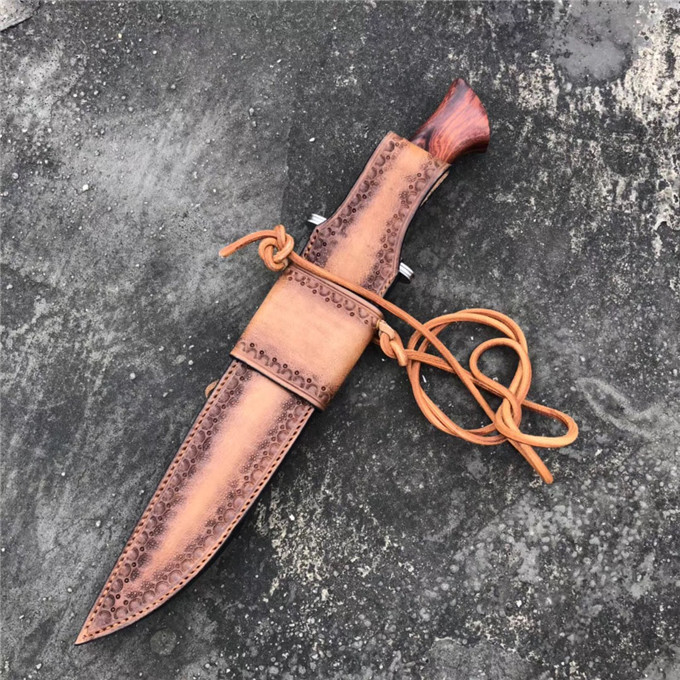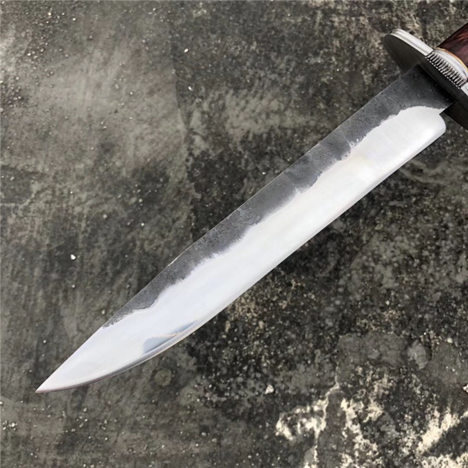 雷蒙·丁直刀 总长:37cm 刃长:24cm 手柄长:13.5cm 刃厚度:5.5mm 刃钢材:俄罗斯高速钢 刃宽:3.5cm 硬度:61HRC 手柄做工/材质:不锈钢圆型护手钢头+黄铜隔片+进口红酸枝木 全程手工开刃,锋利无比,收藏极品之一、喜欢的朋友不可错过 皮套:进口阿根廷牛皮套,手工缝制镶嵌鳄鱼皮、外部设计鞋帽挂带皮配件,方便随身携带