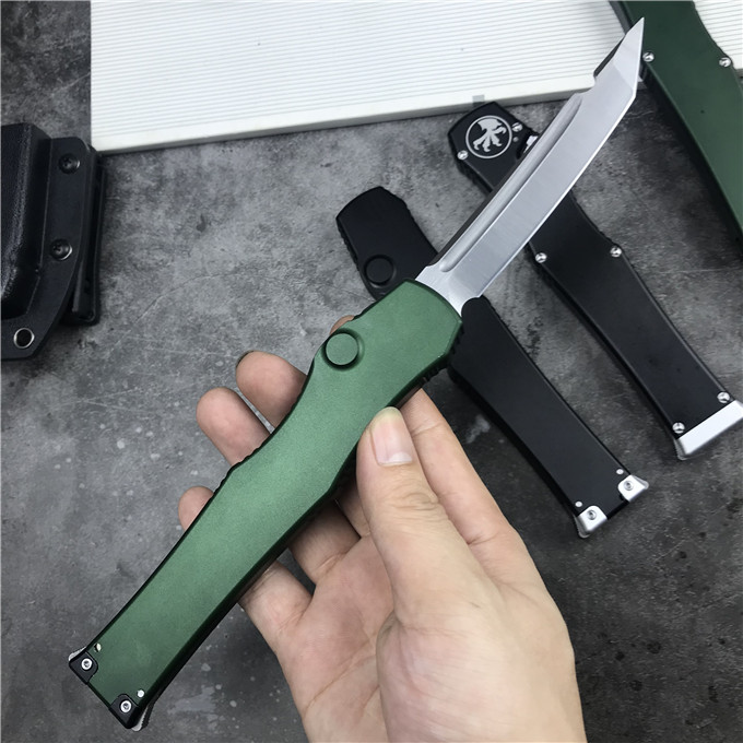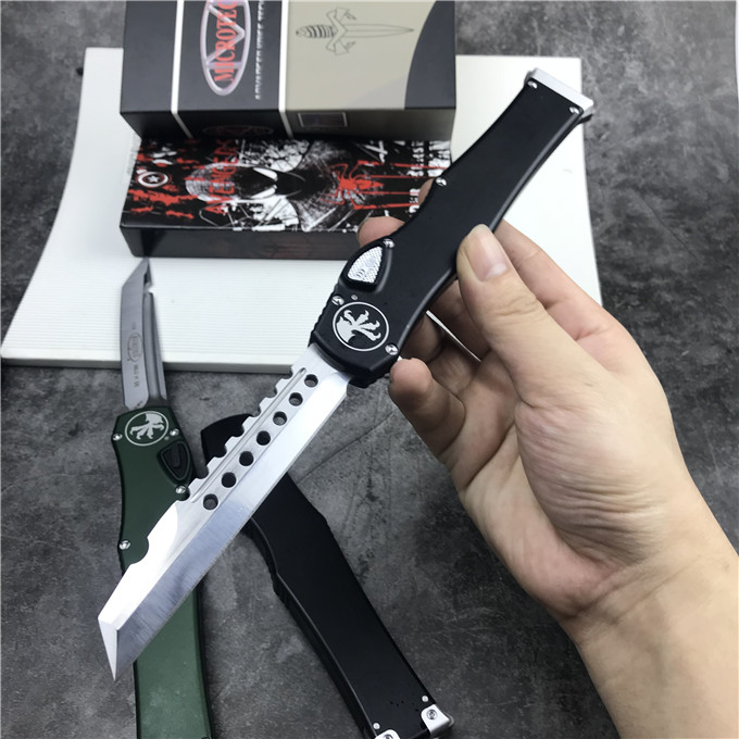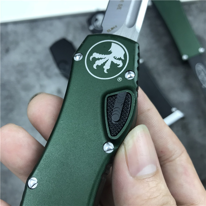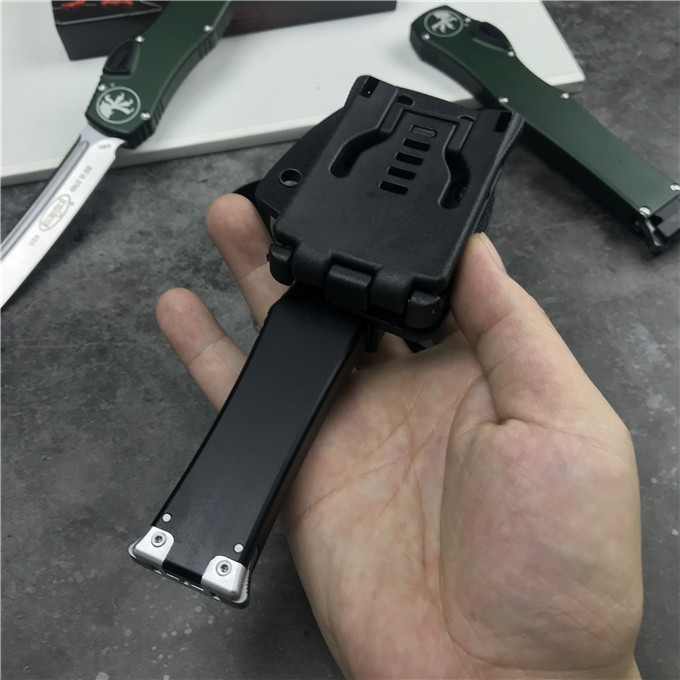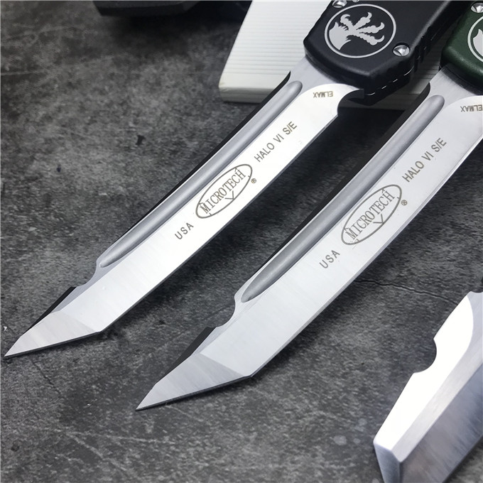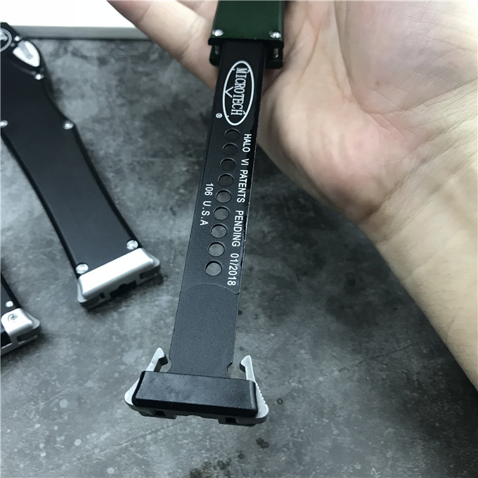 MICROTECH美国微技术150-10 HALO V 6弹跳刀 品牌:MICROTECH美国微技术 刀具全长:27.4CM 刀刃材质:ELMAX 刃长:10.6CM 刃宽:1.98CM 刃厚:0.43CM 柄材:铝合金 刀型:直跳 锁定类型:按钮锁 刀重量:148克 包装重量;278g 附件:Kydex鞘,说 明书,彩盒 整刀用,CNC,电脑锣,线切割制作而成,手工,精密度非常高,很值得收藏的一把刀