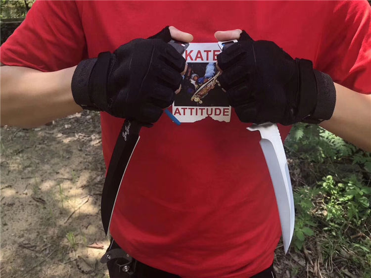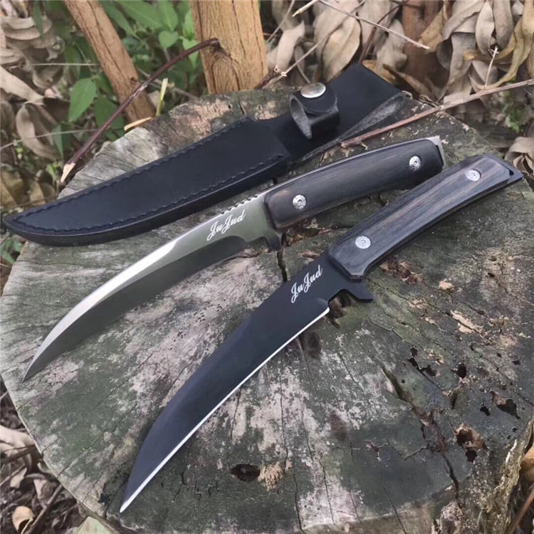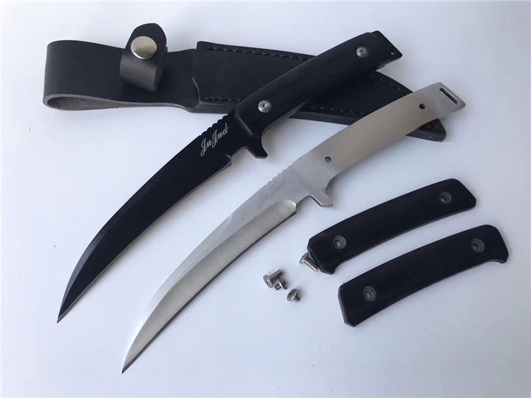 判官狼牙直刀 全长:26.2cm 刃长:12.7cm 柄长:11.5cm 刃材:7cr17 柄材:黑色彩木 刃厚:4mm 处理:真空热处理 硬度:58HRC 其他:配双底骨刀套,持久锋利,款式新,硬度高