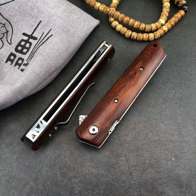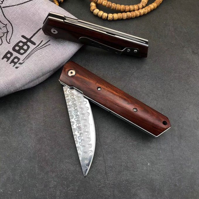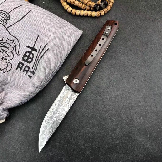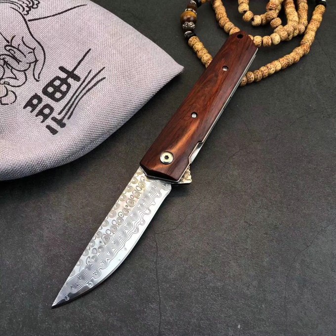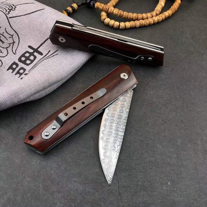 一款简约风格大马折叠刀,滚珠轴承内结构开合快顺自如,进口VG10大马士革钢刀刃制作,手把内加随身携带功能(刀夹)搭配微粒黄檀木手柄,黄檀木表面光滑细腻,由资深老师傅纯手工装配制合,无论品质或做工都非常不错一把手工刀...