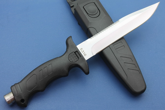 性能特点:潜水刀由刀体与刀鞘组成,具有割、砍、刺、锤、挑等功能,能够迅速割断缠绕的网绳,刺穿1毫米厚的低碳钢板,砍断直径50毫米的杂木,手柄尾部锺击块可以锤击贝壳类海洋生物等