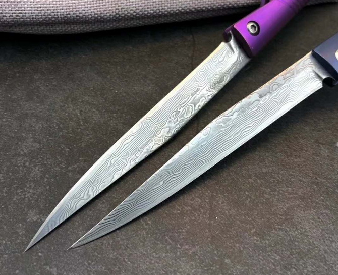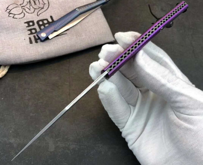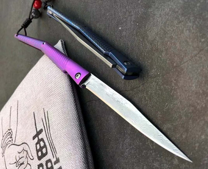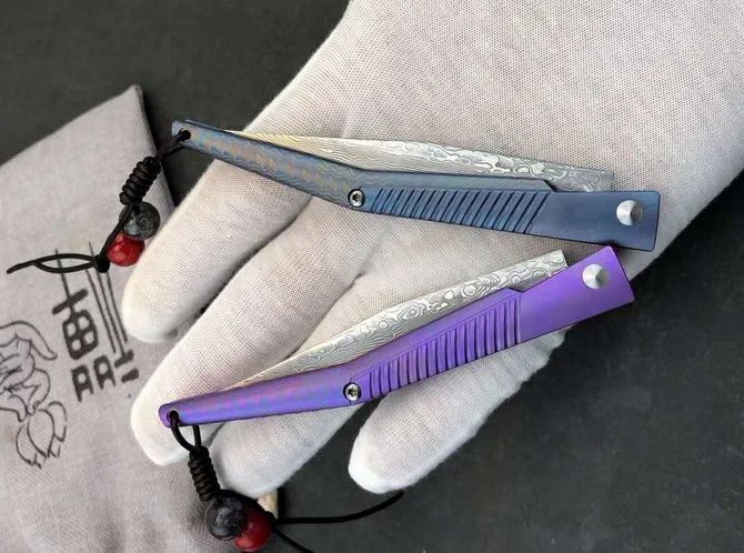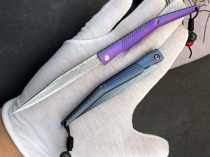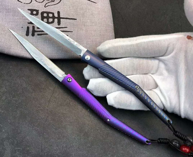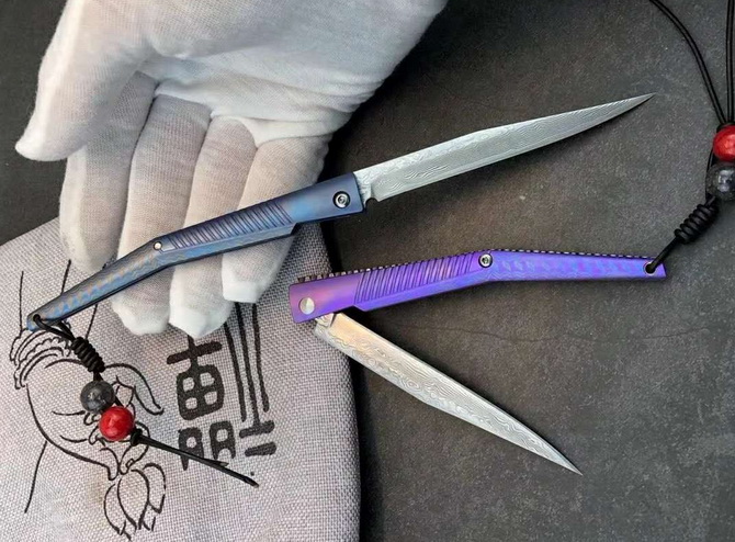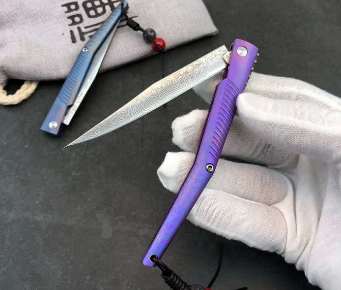 大马士革水黄蜂二代钛马折刀 总长:19.5cm 刃长:8.3cm 柄长:10.5cm 刃宽:1cm 刃厚:2mm 净重≈48g 刃材:大马士革钢 柄材:TC4钛合金 包装:绒布袋+高端轧纹黑礼盒 注意:刃材真空淬火锋利无比使用需注意 国庆新款上线与众不同,全新概念TC4钛合金手柄加彩色波浪纹大马士革vg10钢芯刀刃独特背锁设计开,关自如经久实用CNC电脑锣蜂窝背骨重资打造高端耐看收藏把玩送礼全网通用