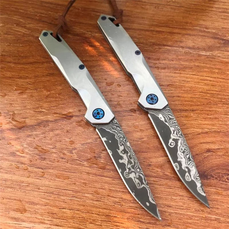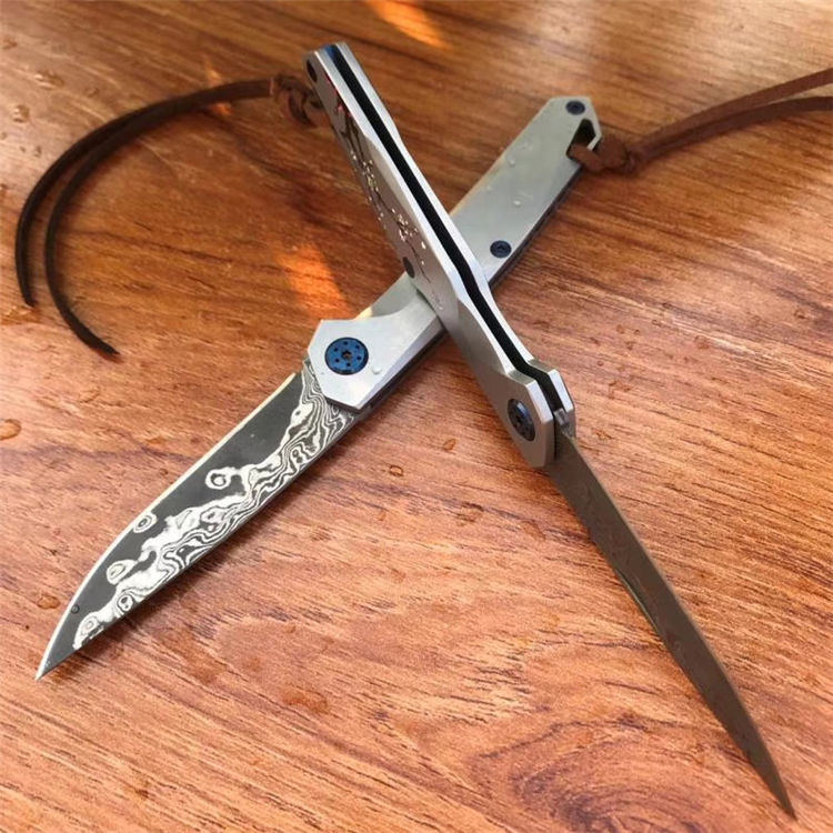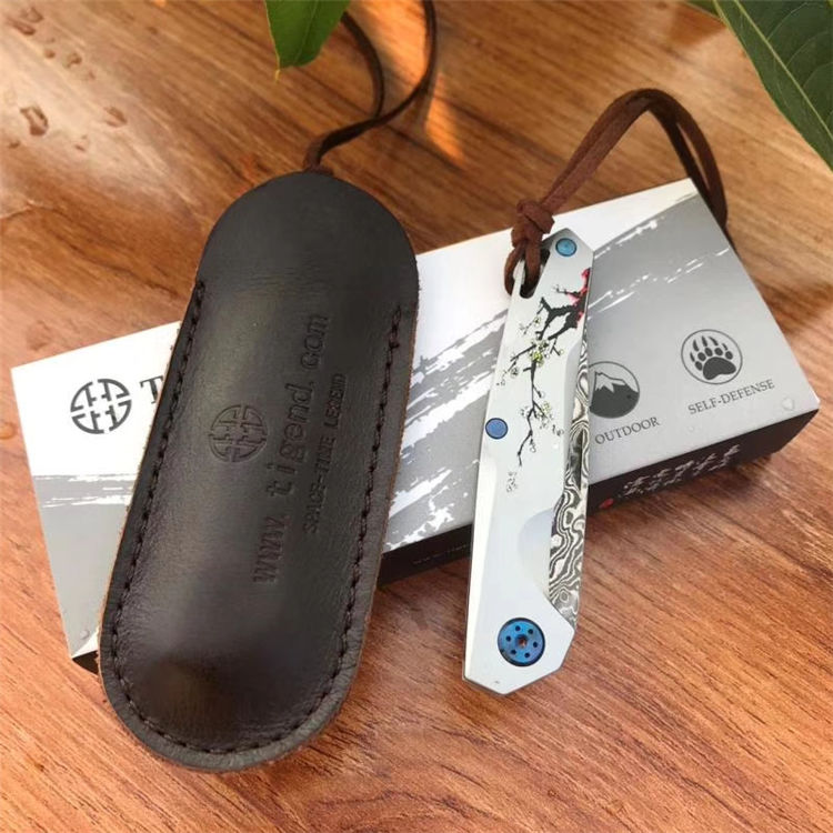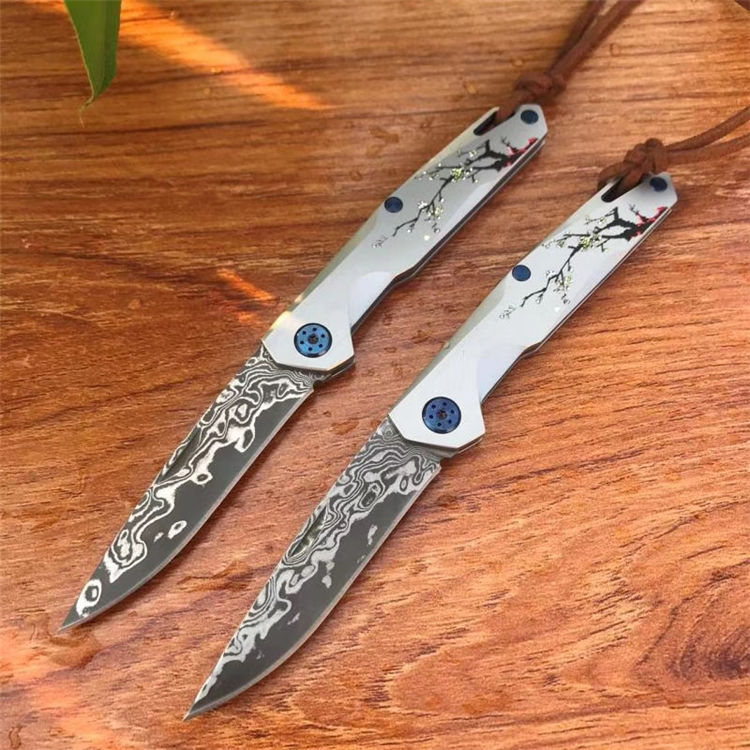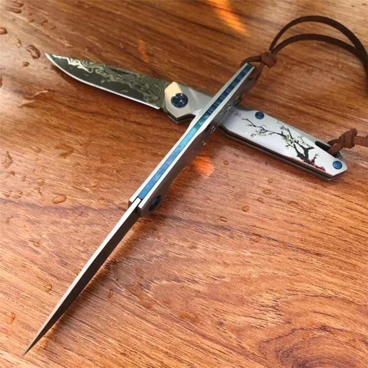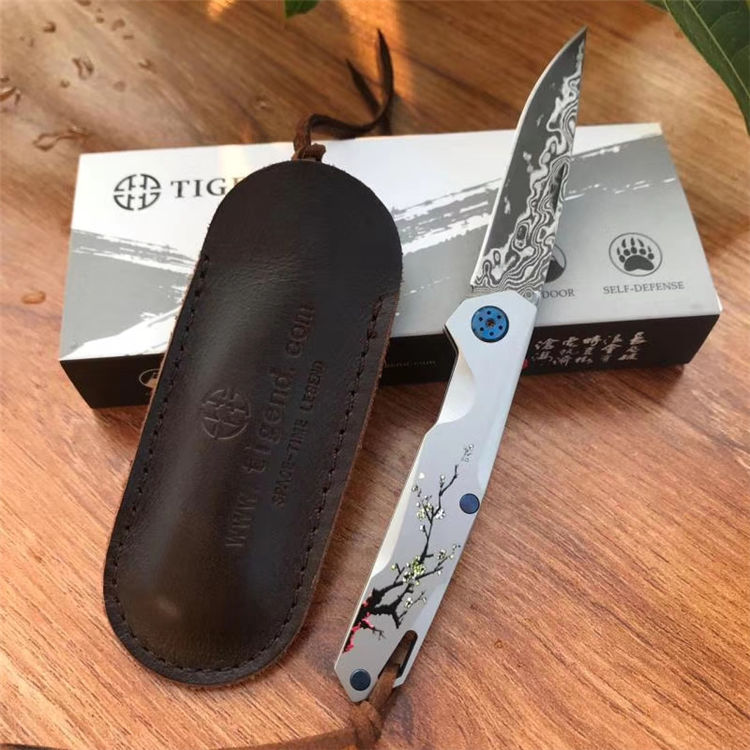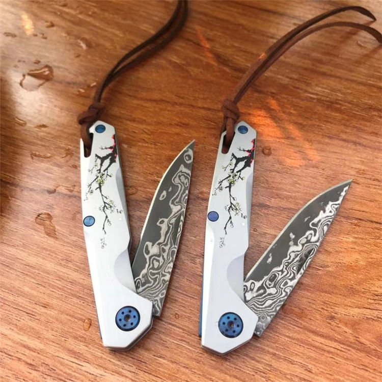 大马士革一枝梅折刀 全长:14.0cm 刃长:6.0cm 柄长:8.0cm 刃厚:1.9mm 刃宽:1.3cm 刃材:大马士革钢 硬度:58-60HRC 重量:约80克(含包装) 表面:锻打大马士革祥云花纹原色 柄材:不锈钢表面灰钛+刻花 配送:高档礼品盒+U型手工皮套+皮绳
