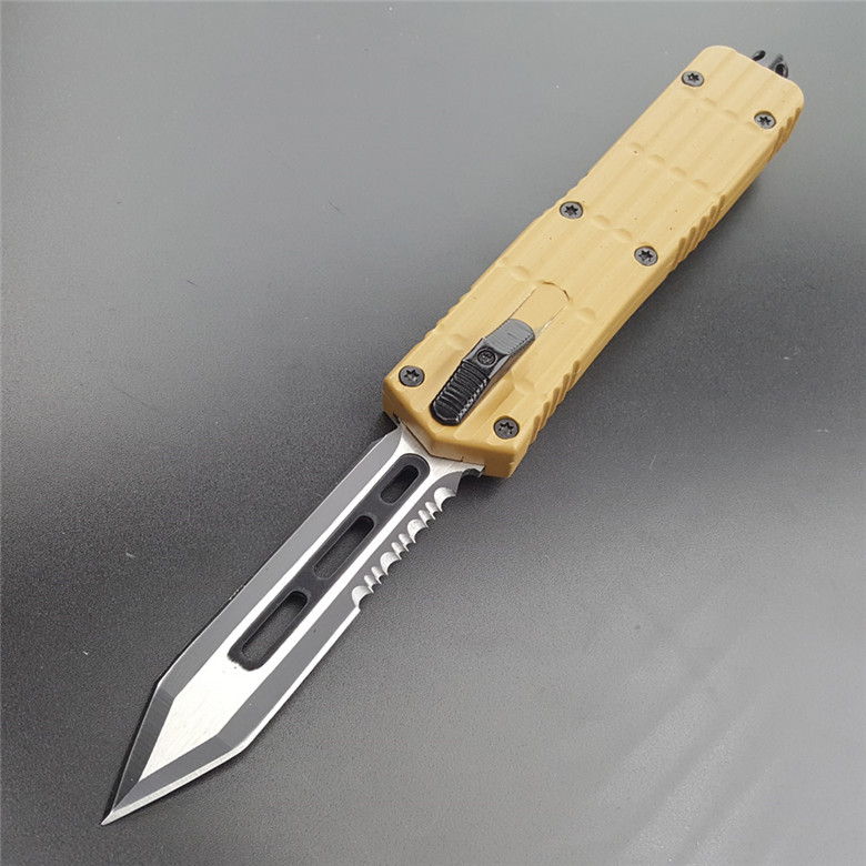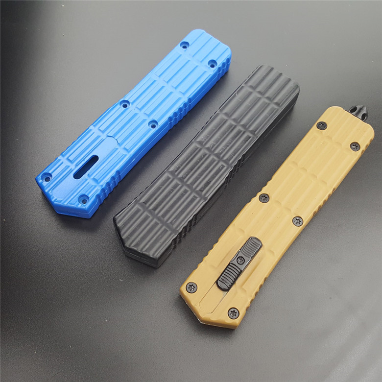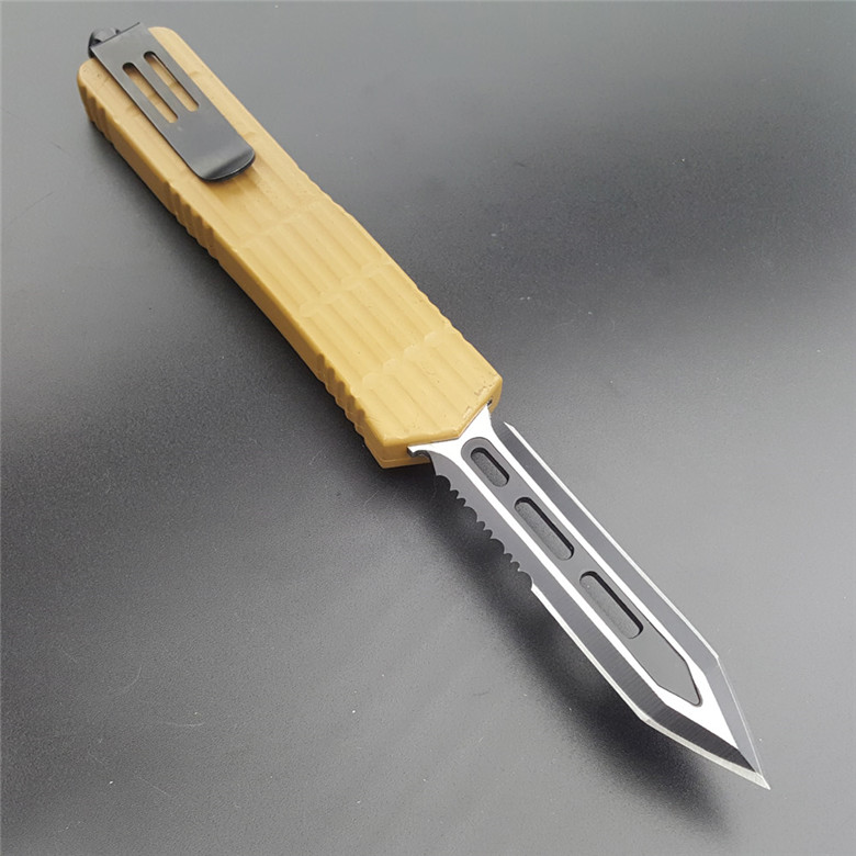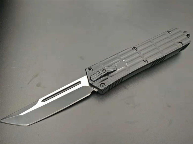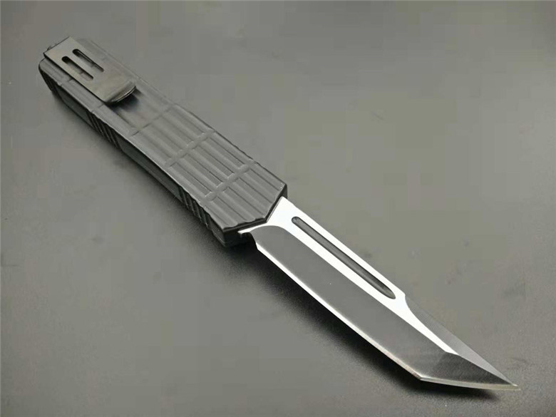 微技术铁甲跳刀 全长:22.5CM 刃长:9CM 柄长:13.5CM 刃厚:0.3CM 硬度:56HRC 刃材:440 净重:295克(整刀) 毛重:320克(含包装物) 开合:双动作,直推开关,自动弹出和收回 包装:耐磨专用战术尼龙套 玻璃敲击器:不锈钢玻璃敲击器
